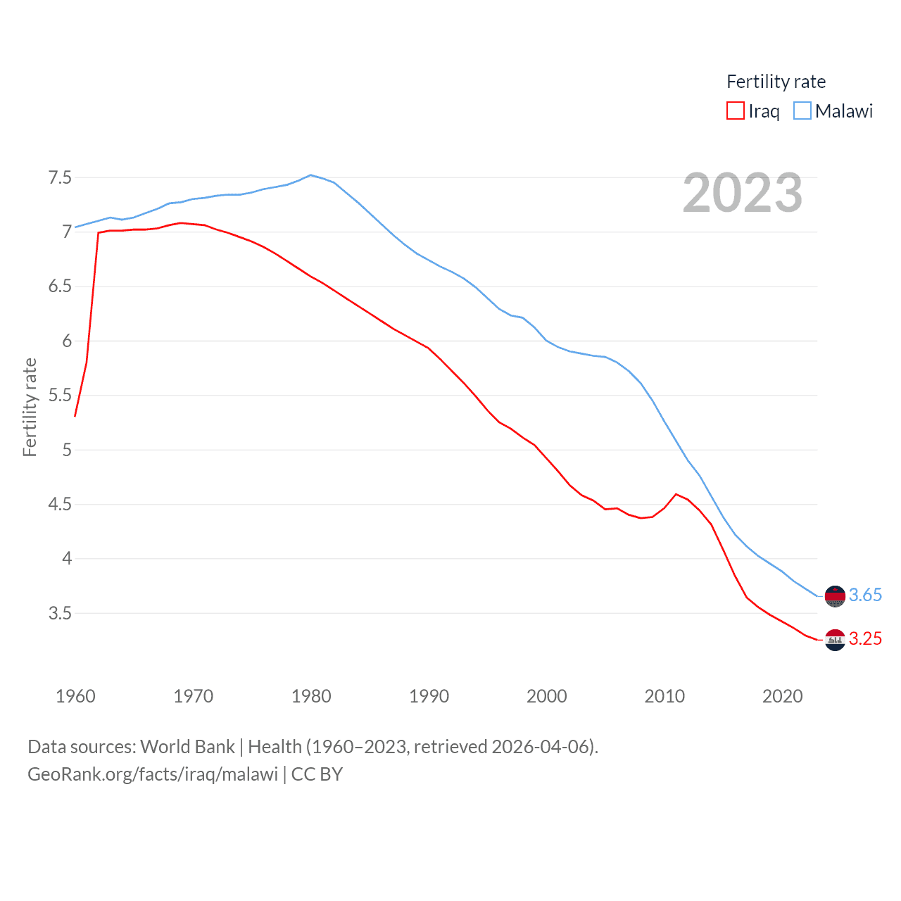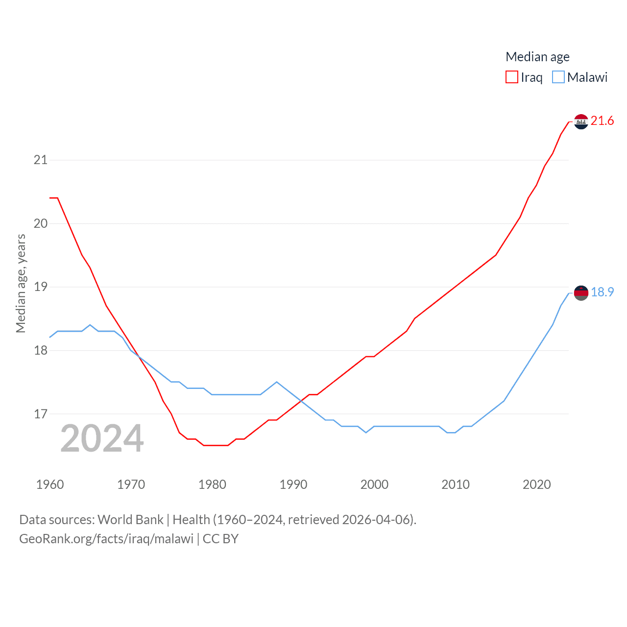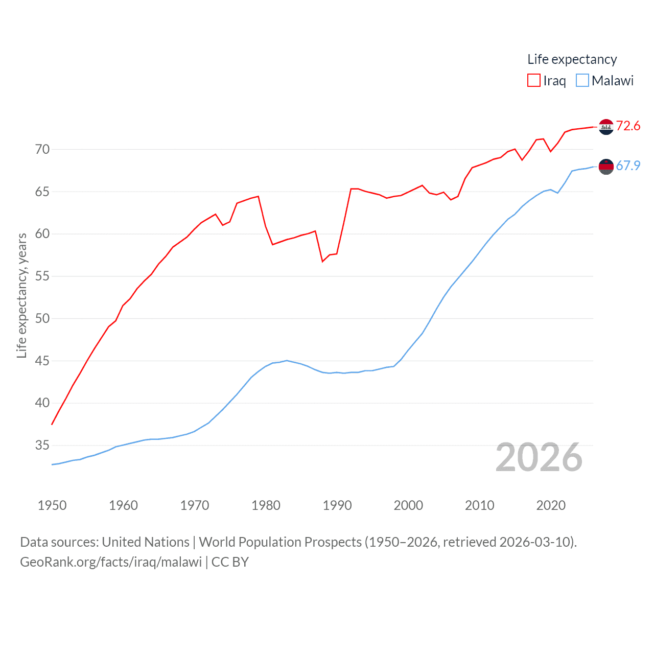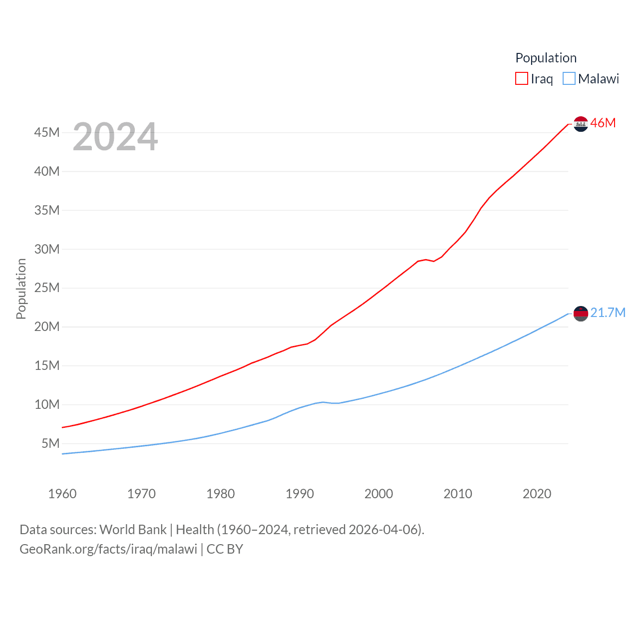 Iraq has a population of 46M (ranked 34/197), compared with 21.7M in Malawi (ranked 62/197). Iraq's land area is 167,619 sq mi versus 36,402 sq mi for Malawi (ranked 57th vs. 107th).