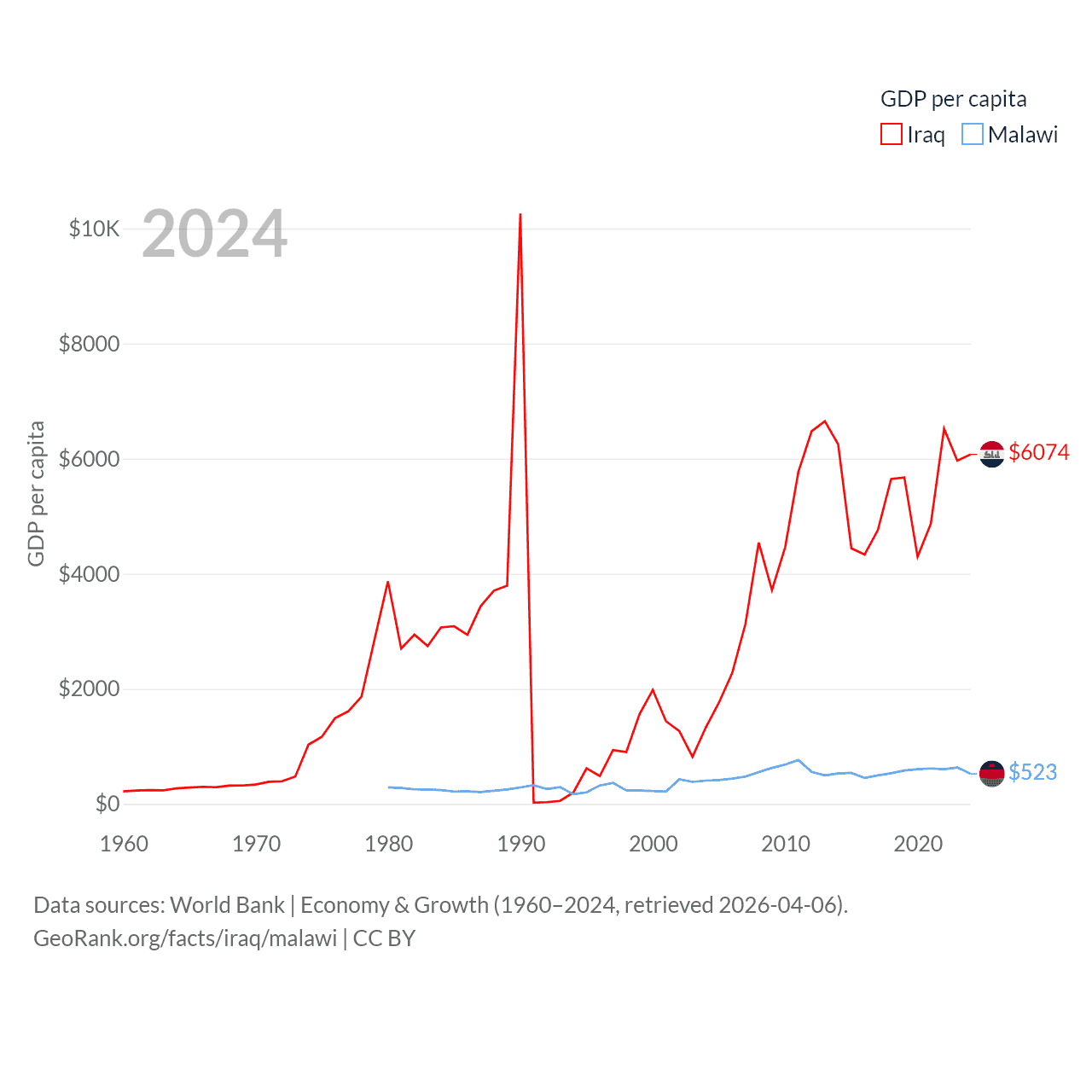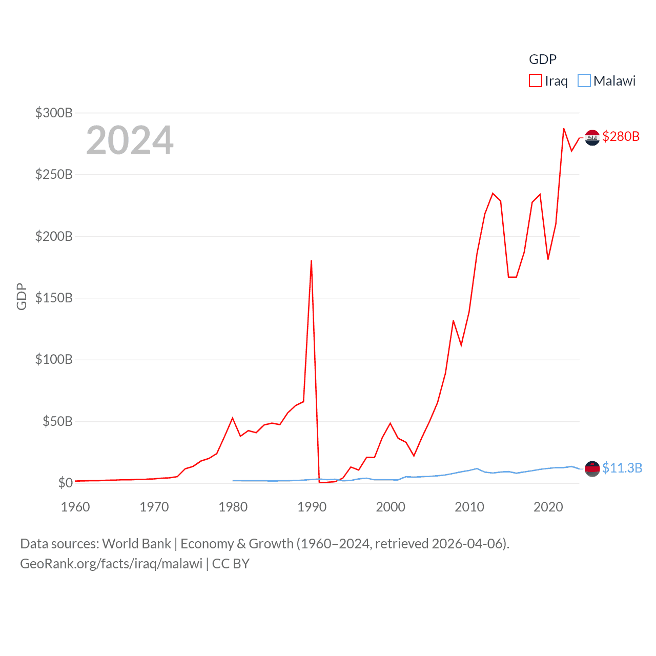By GDP, Iraq ranks 50/197 ($280B) and Malawi ranks 151/197 ($11.3B). By GDP per capita, Iraq ranks 113/197 ($6,074), while Malawi ranks 194/197 ($523).
