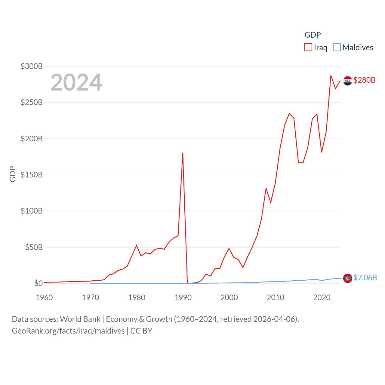 By GDP, Iraq ranks 50/197 ($280B) and Maldives ranks 159/197 ($7.06B). By GDP per capita, Iraq ranks 113/197 ($6,074), while Maldives ranks 75/197 ($13,379).