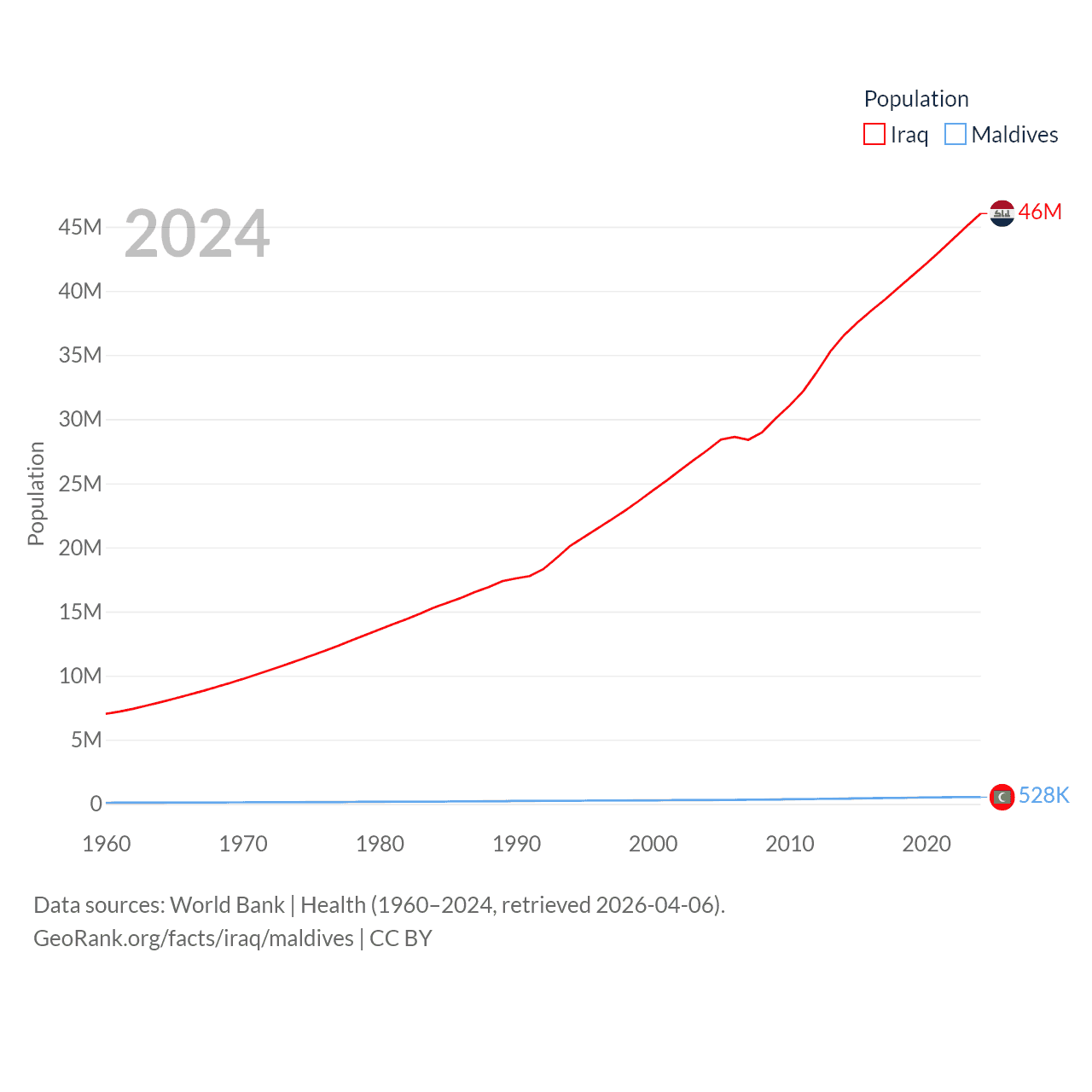 Iraq has a population of 46M (ranked 34/197), compared with 528K in Maldives (ranked 168/197). Iraq's land area is 167,619 sq mi versus 115.1 sq mi for Maldives (ranked 57th vs. 188th).