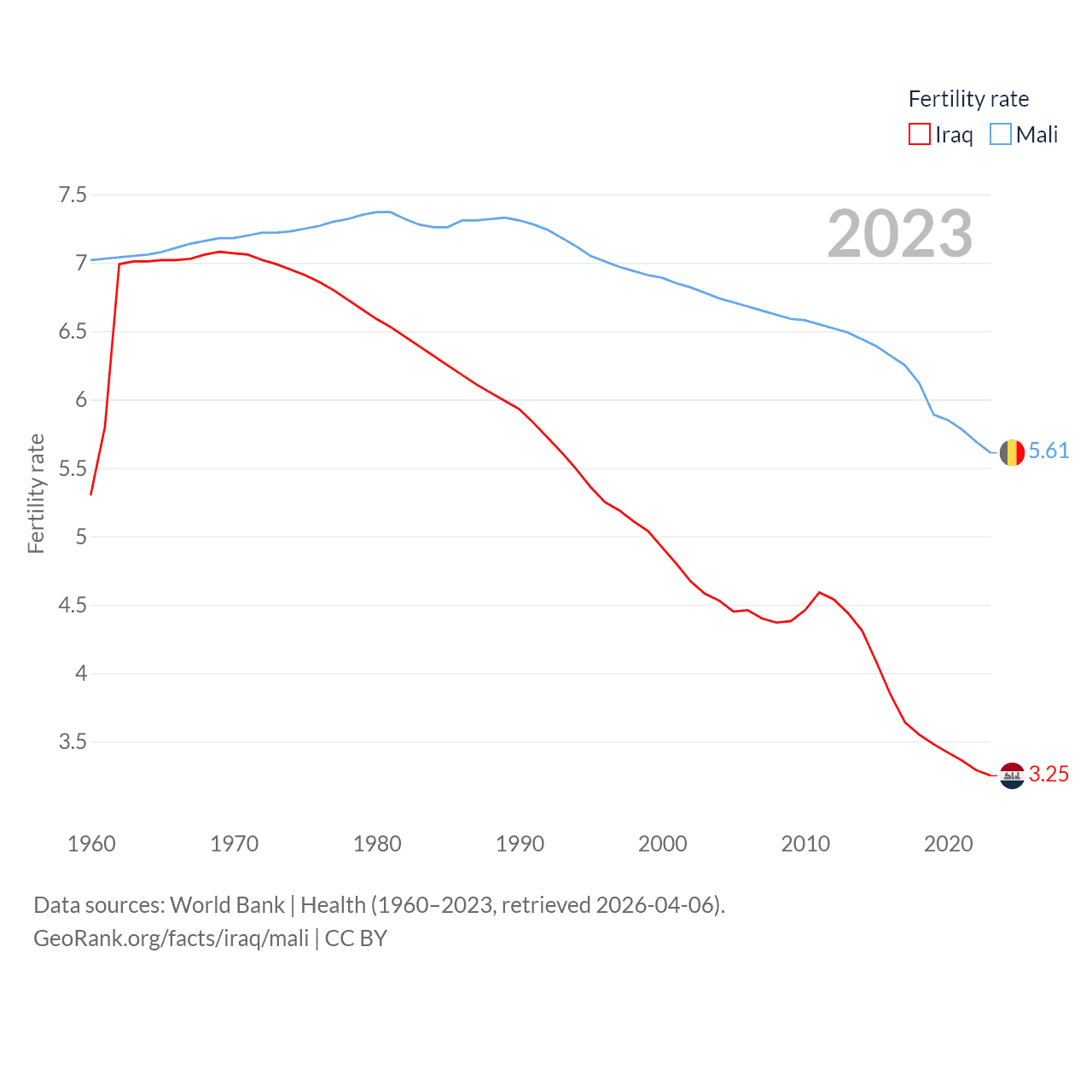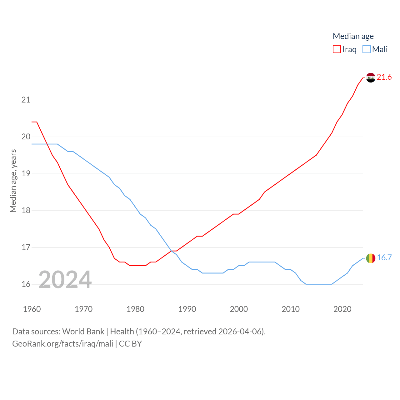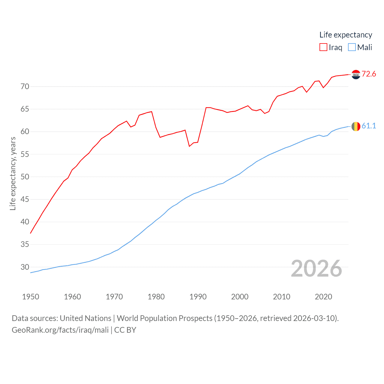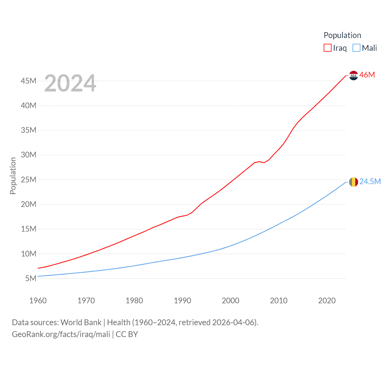 Iraq has a population of 46M (ranked 34/197), compared with 24.5M in Mali (ranked 58/197). Iraq's land area is 167,619 sq mi versus 471,118 sq mi for Mali (ranked 57th vs. 23rd).