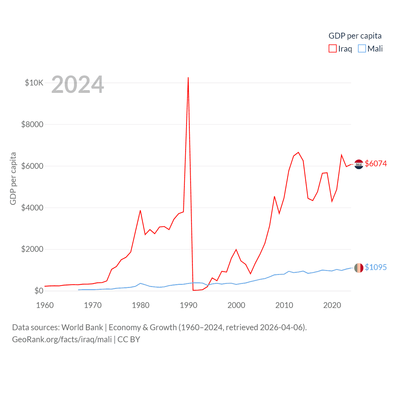 By GDP, Iraq ranks 50/197 ($280B) and Mali ranks 113/197 ($26.8B). By GDP per capita, Iraq ranks 113/197 ($6,074), while Mali ranks 173/197 ($1,095).