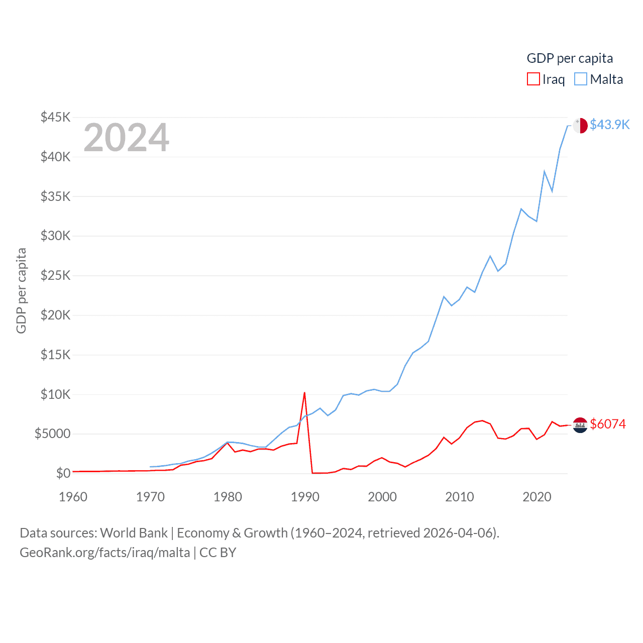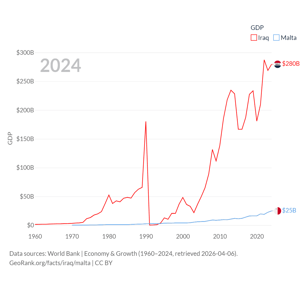 By GDP, Iraq ranks 50/197 ($280B) and Malta ranks 119/197 ($25B). By GDP per capita, Iraq ranks 113/197 ($6,074), while Malta ranks 28/197 ($43,899).