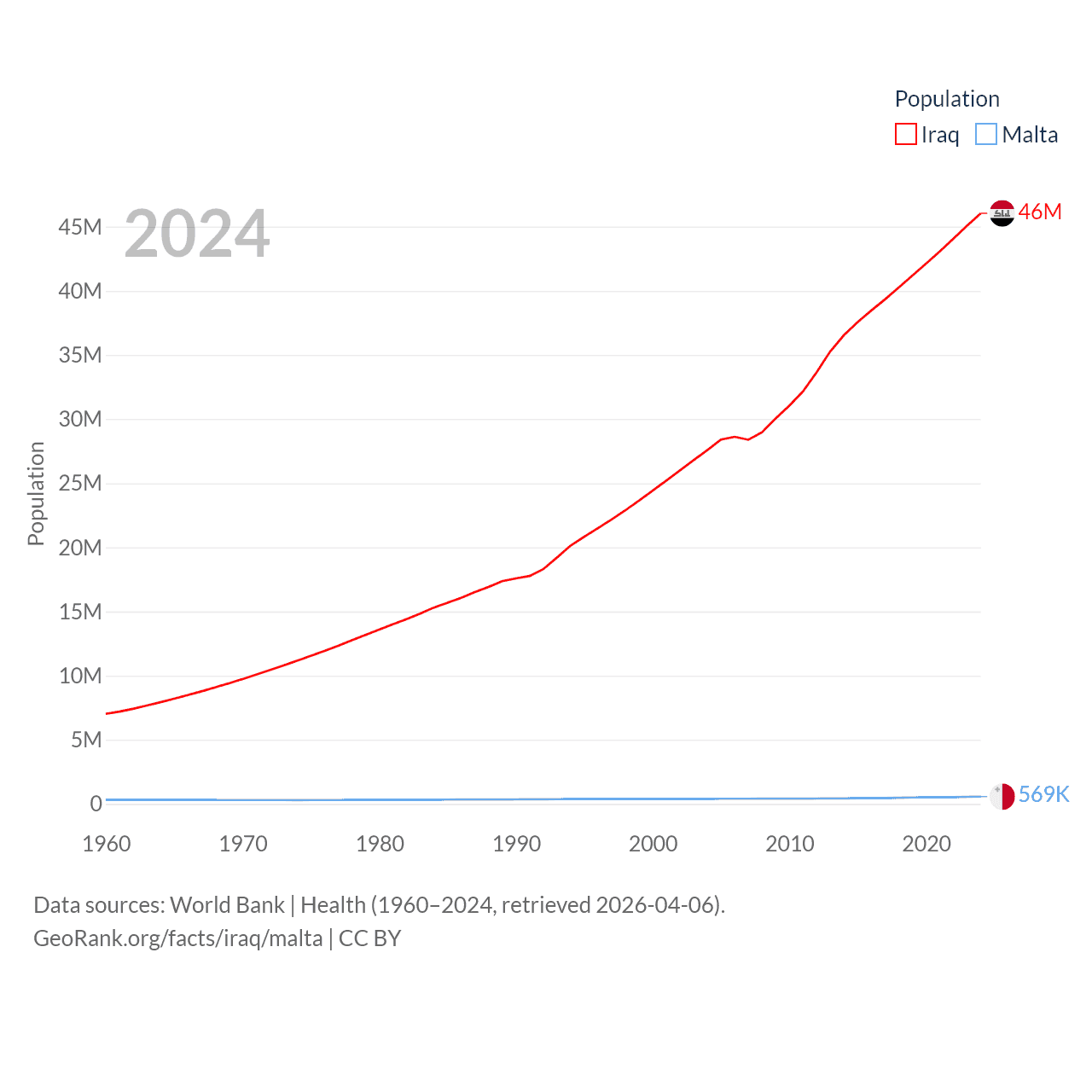 Iraq has a population of 46M (ranked 34/197), compared with 569K in Malta (ranked 167/197). Iraq's land area is 167,619 sq mi versus 123.6 sq mi for Malta (ranked 57th vs. 187th).