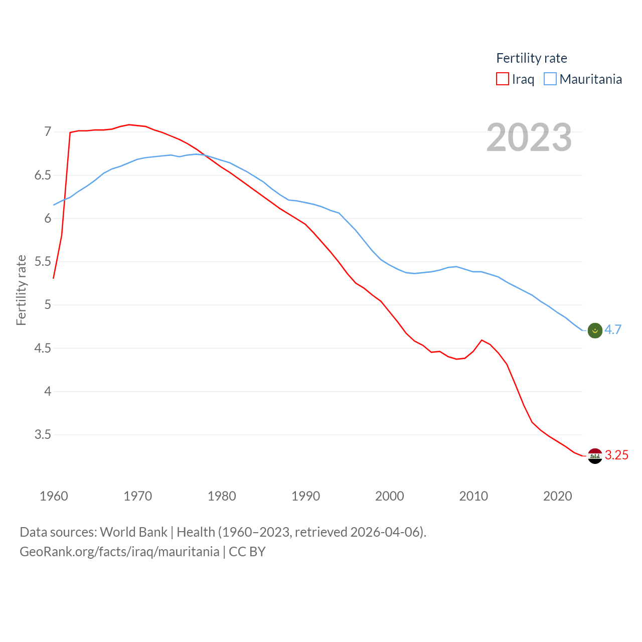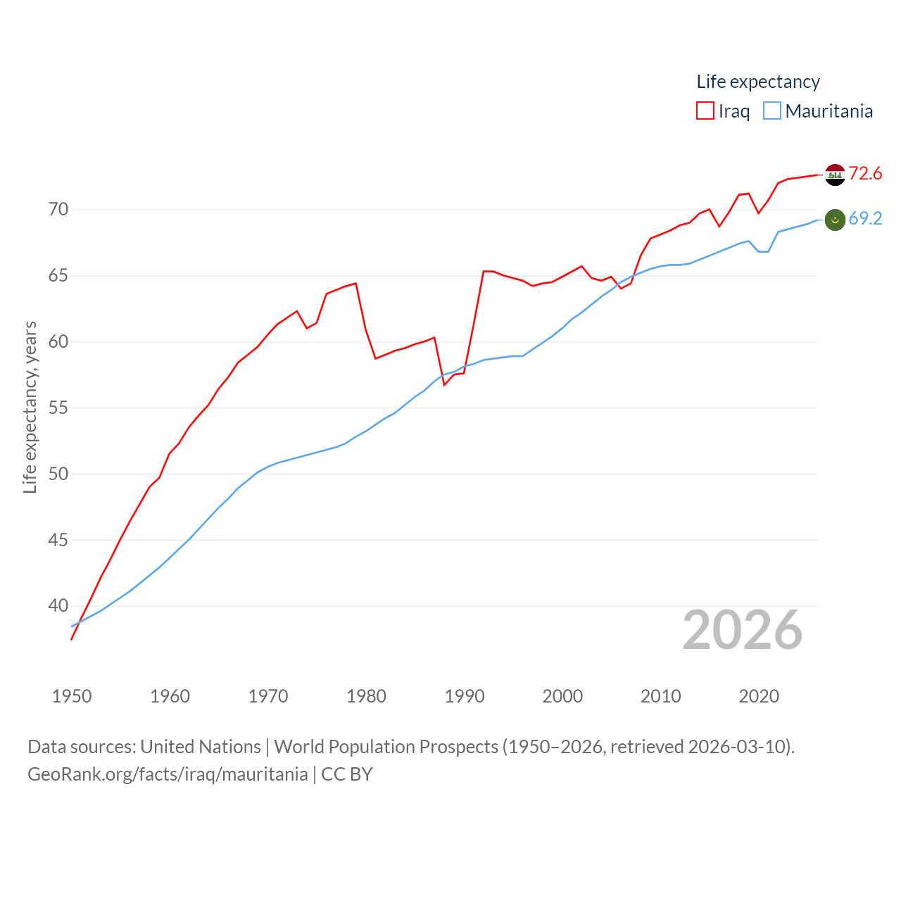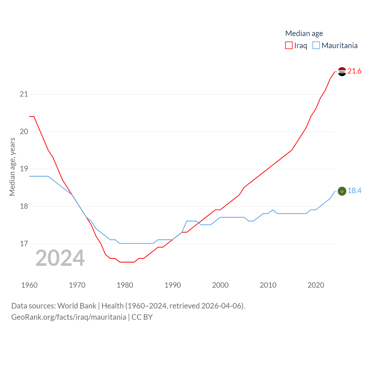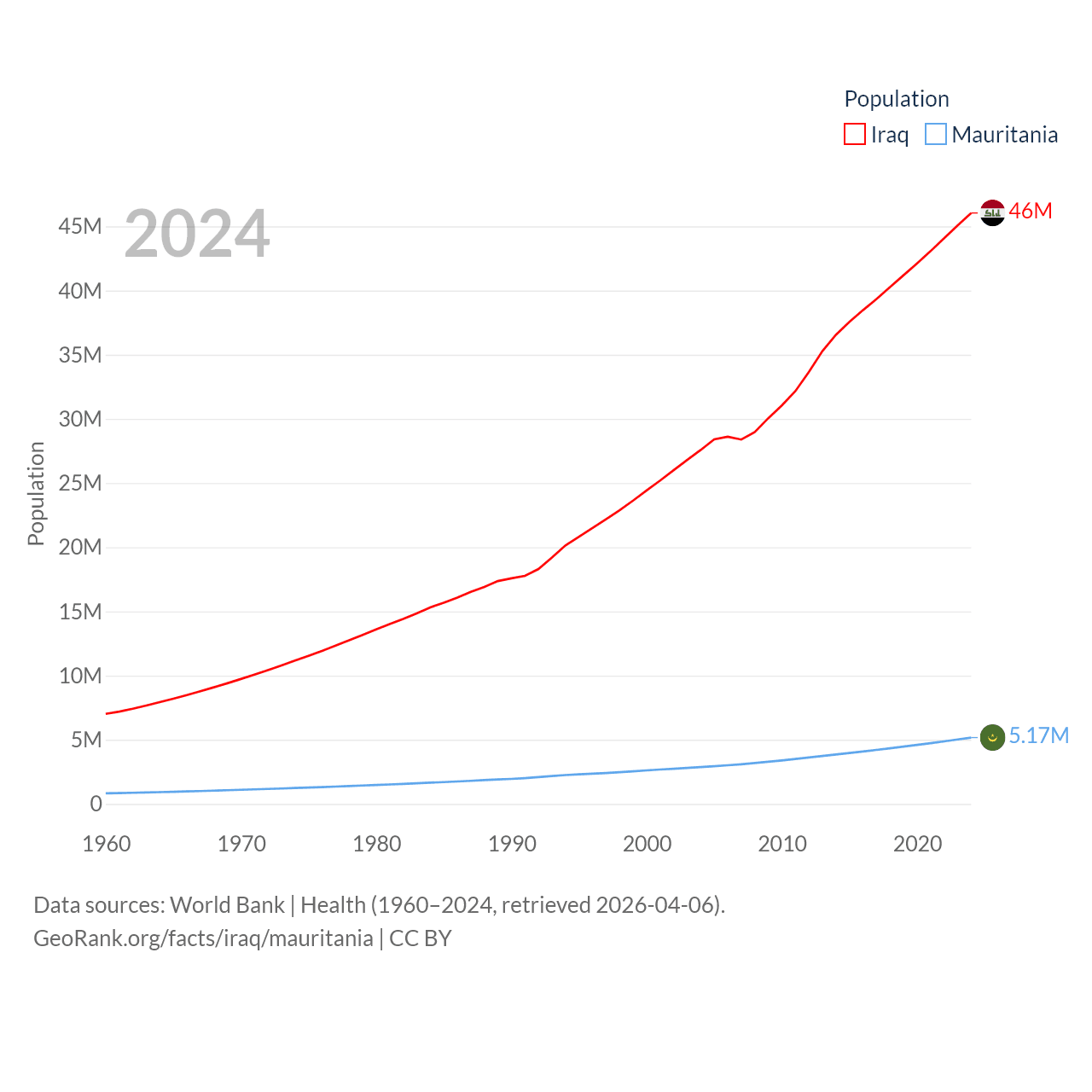 Iraq has a population of 46M (ranked 34/197), compared with 5.17M in Mauritania (ranked 125/197). Iraq's land area is 167,619 sq mi versus 397,955 sq mi for Mauritania (ranked 57th vs. 28th).