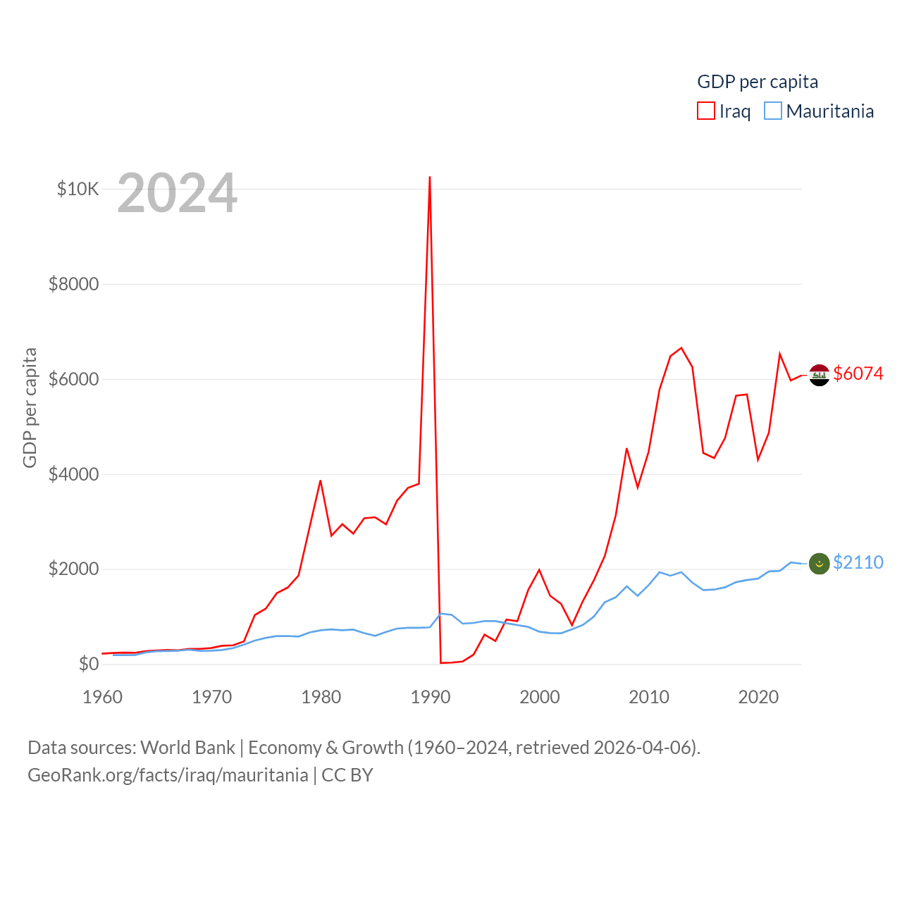 By GDP, Iraq ranks 50/197 ($280B) and Mauritania ranks 153/197 ($10.9B). By GDP per capita, Iraq ranks 113/197 ($6,074), while Mauritania ranks 156/197 ($2,110).