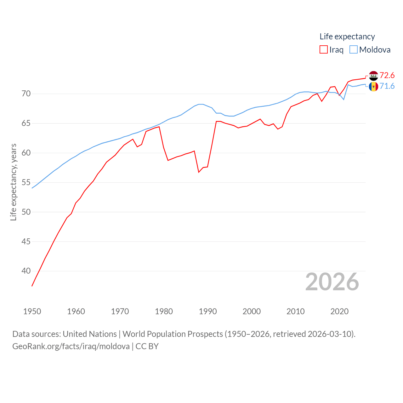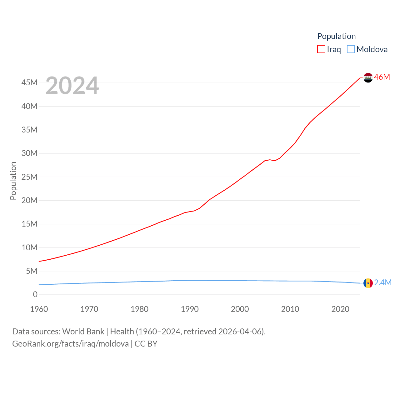 Iraq has a population of 46M (ranked 34/197), compared with 2.4M in Moldova (ranked 143/197). Iraq's land area is 167,619 sq mi versus 12,714 sq mi for Moldova (ranked 57th vs. 135th).