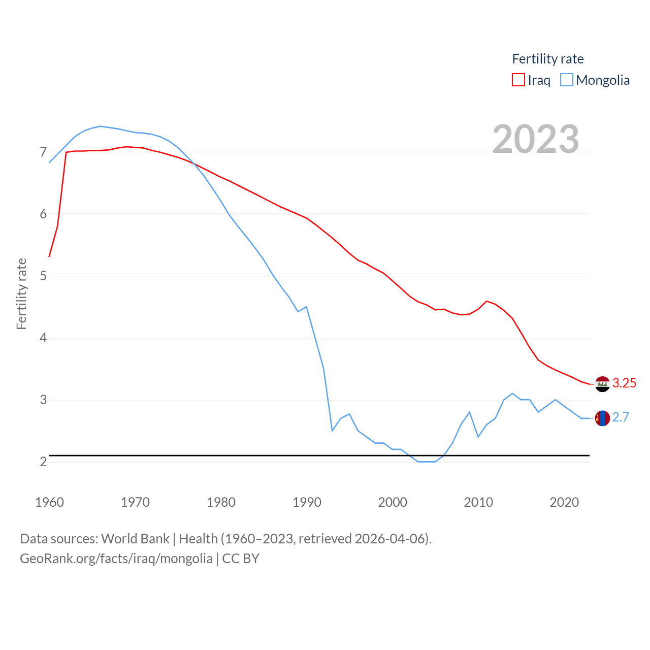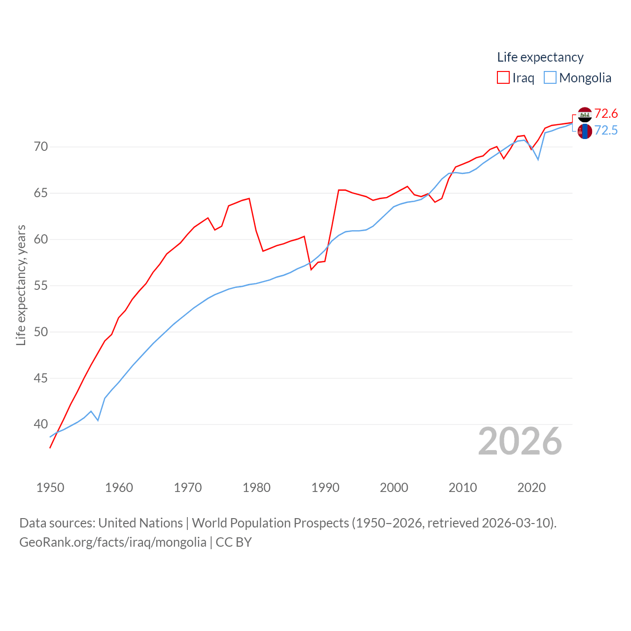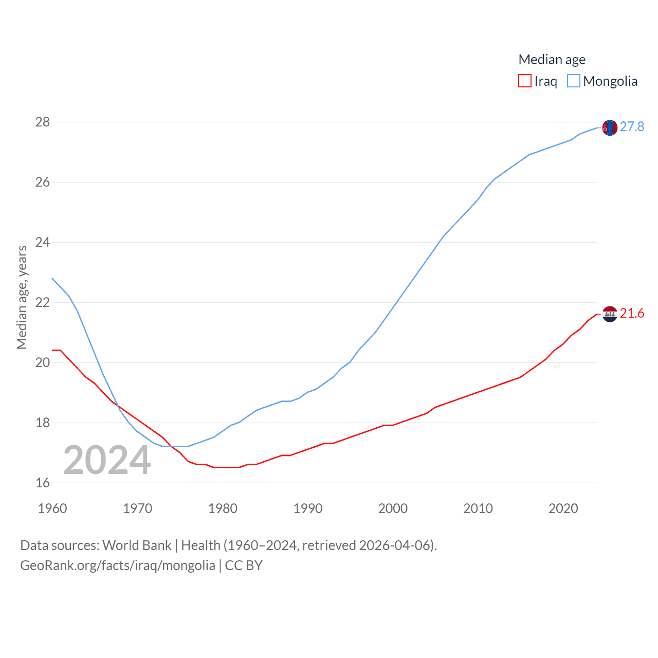 Iraq has a population of 46M (ranked 34/197), compared with 3.52M in Mongolia (ranked 132/197). Iraq's land area is 167,619 sq mi versus 601,740 sq mi for Mongolia (ranked 57th vs. 18th).