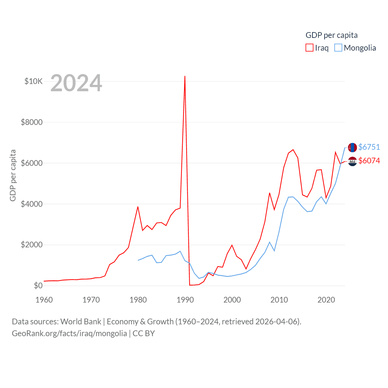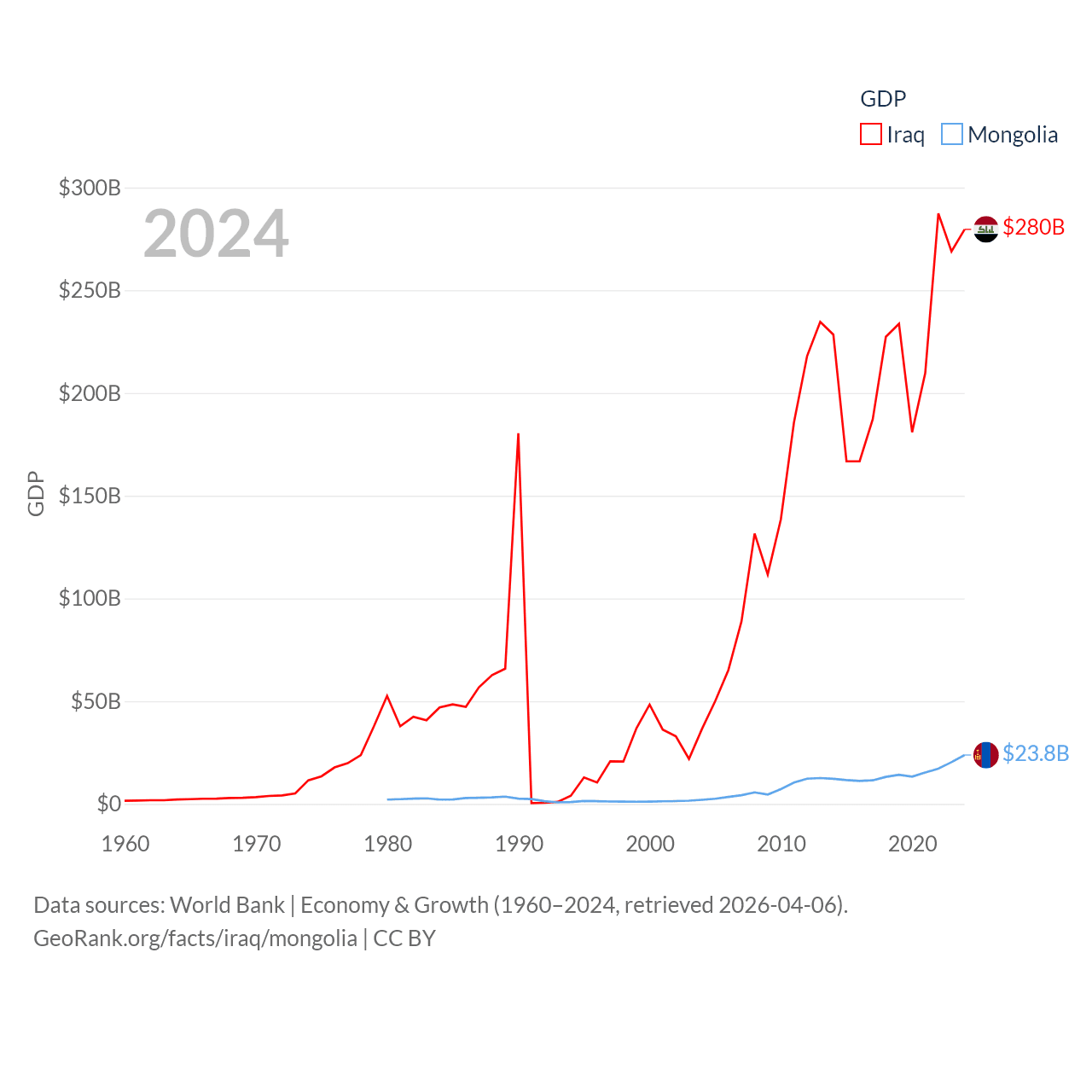 By GDP, Iraq ranks 50/197 ($280B) and Mongolia ranks 121/197 ($23.8B). By GDP per capita, Iraq ranks 113/197 ($6,074), while Mongolia ranks 105/197 ($6,751).