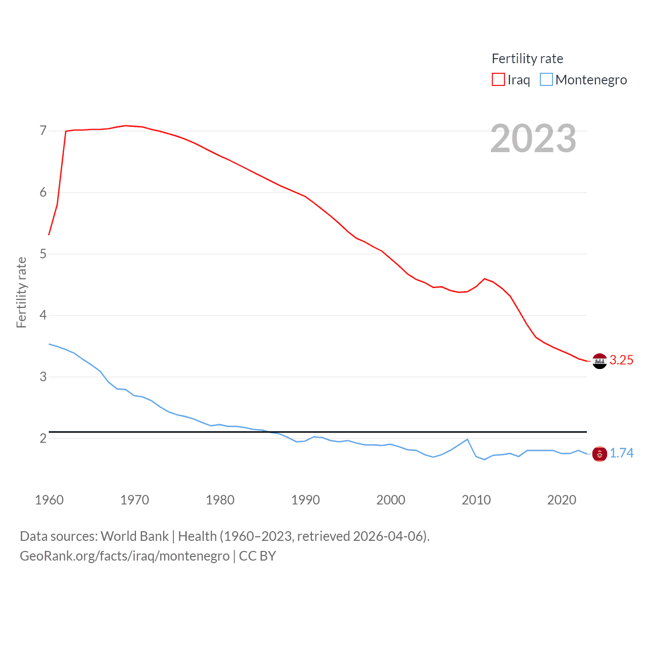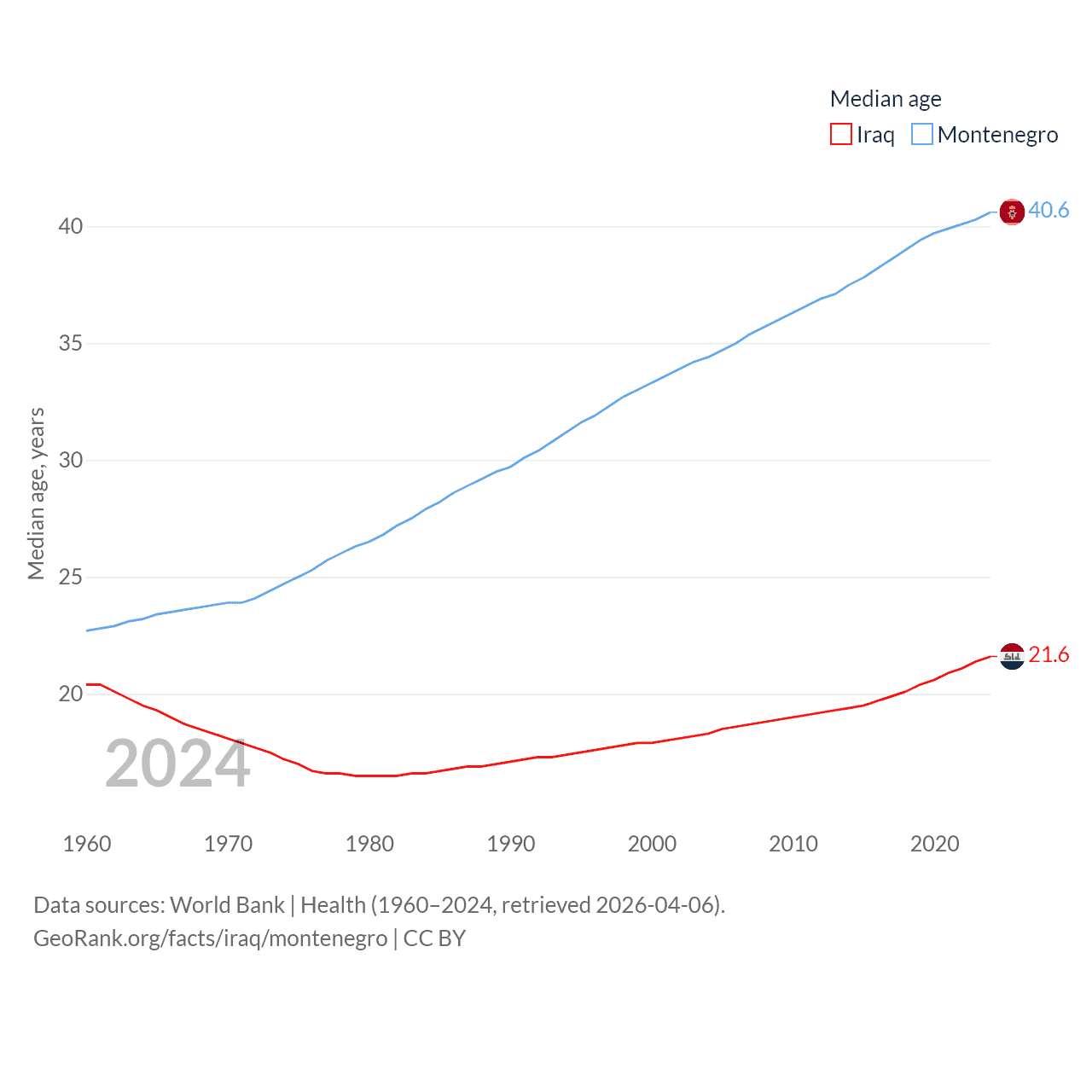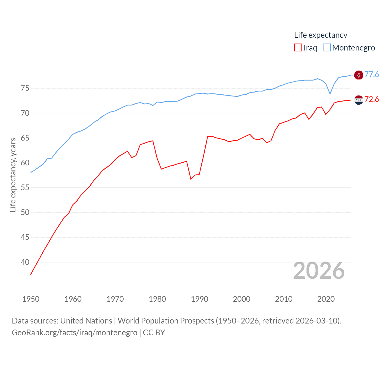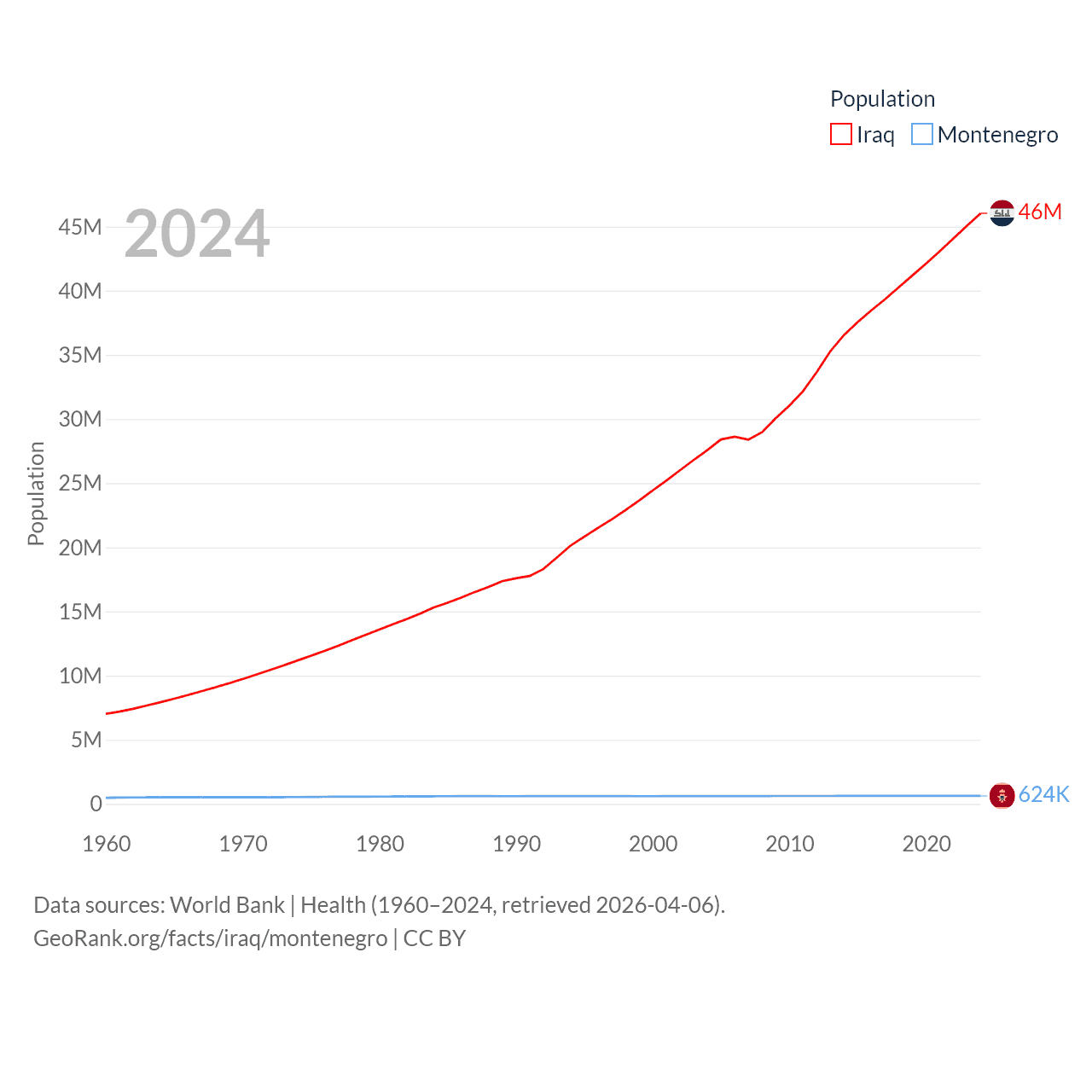 Iraq has a population of 46M (ranked 34/197), compared with 624K in Montenegro (ranked 166/197). Iraq's land area is 167,619 sq mi versus 5,193 sq mi for Montenegro (ranked 57th vs. 156th).
