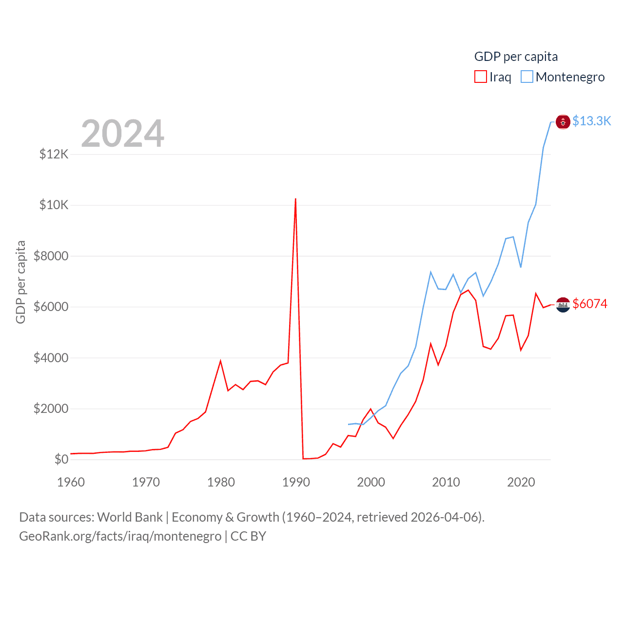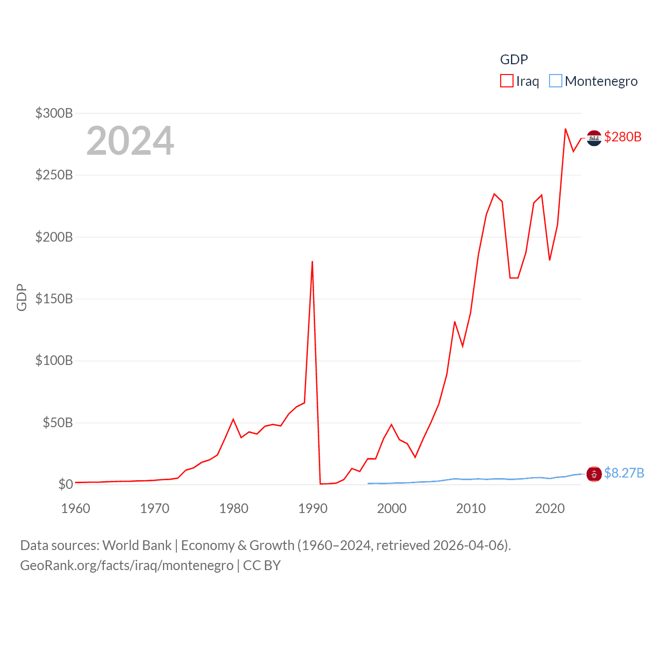 By GDP, Iraq ranks 50/197 ($280B) and Montenegro ranks 155/197 ($8.27B). By GDP per capita, Iraq ranks 113/197 ($6,074), while Montenegro ranks 77/197 ($13,263).