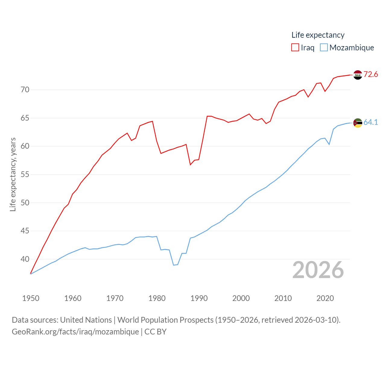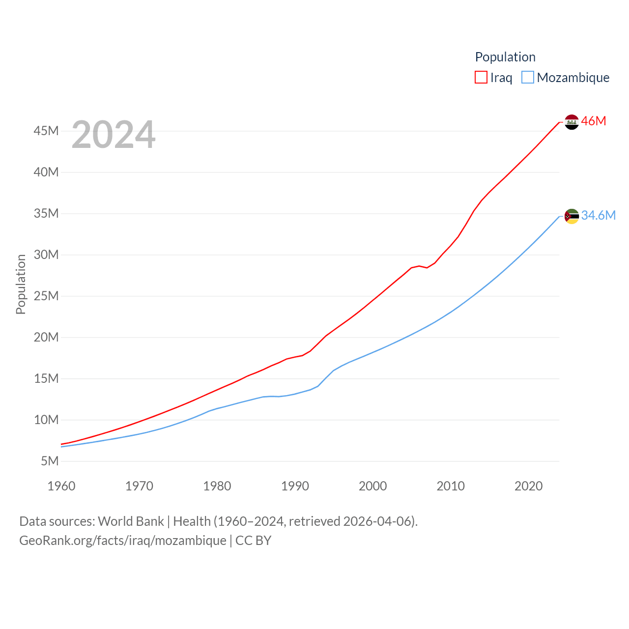 Iraq has a population of 46M (ranked 34/197), compared with 34.6M in Mozambique (ranked 46/197). Iraq's land area is 167,619 sq mi versus 303,623 sq mi for Mozambique (ranked 57th vs. 34th).