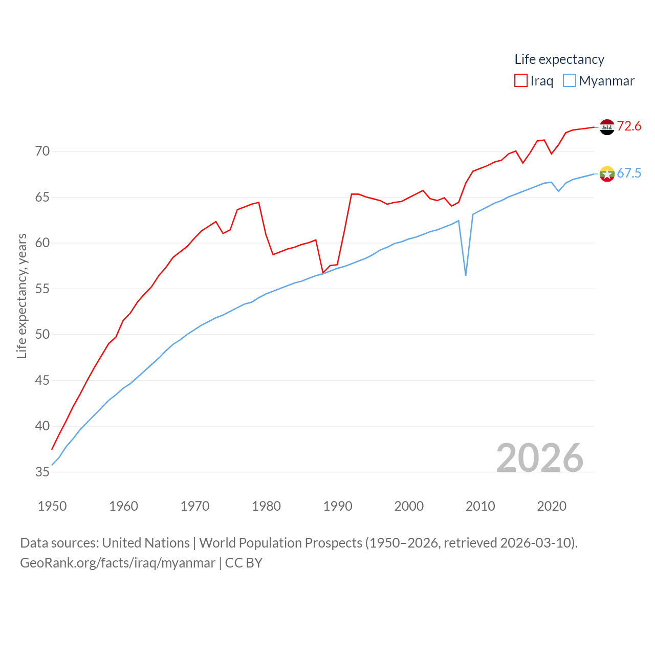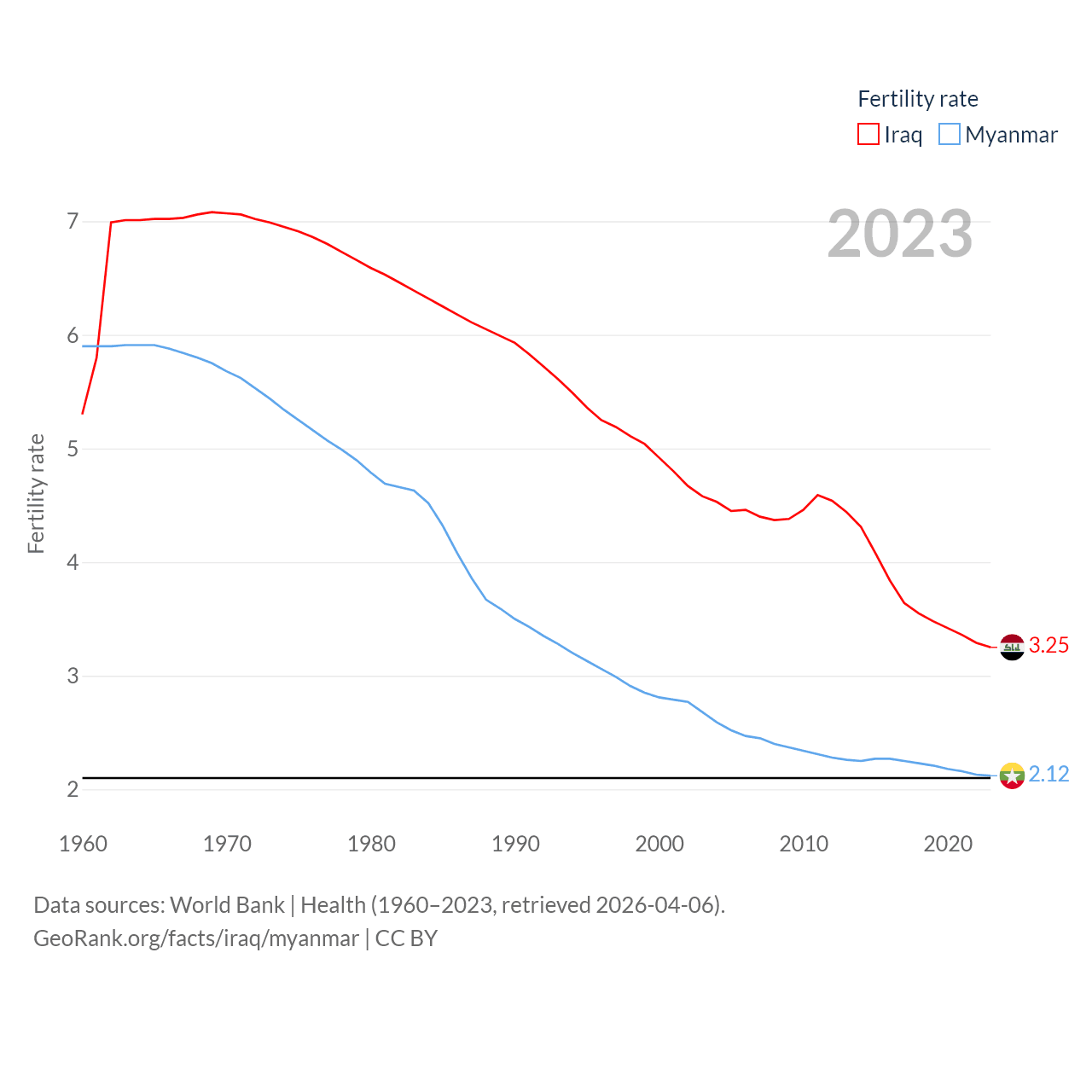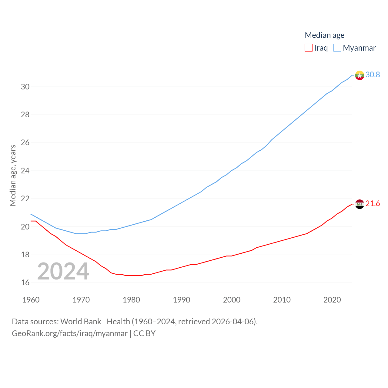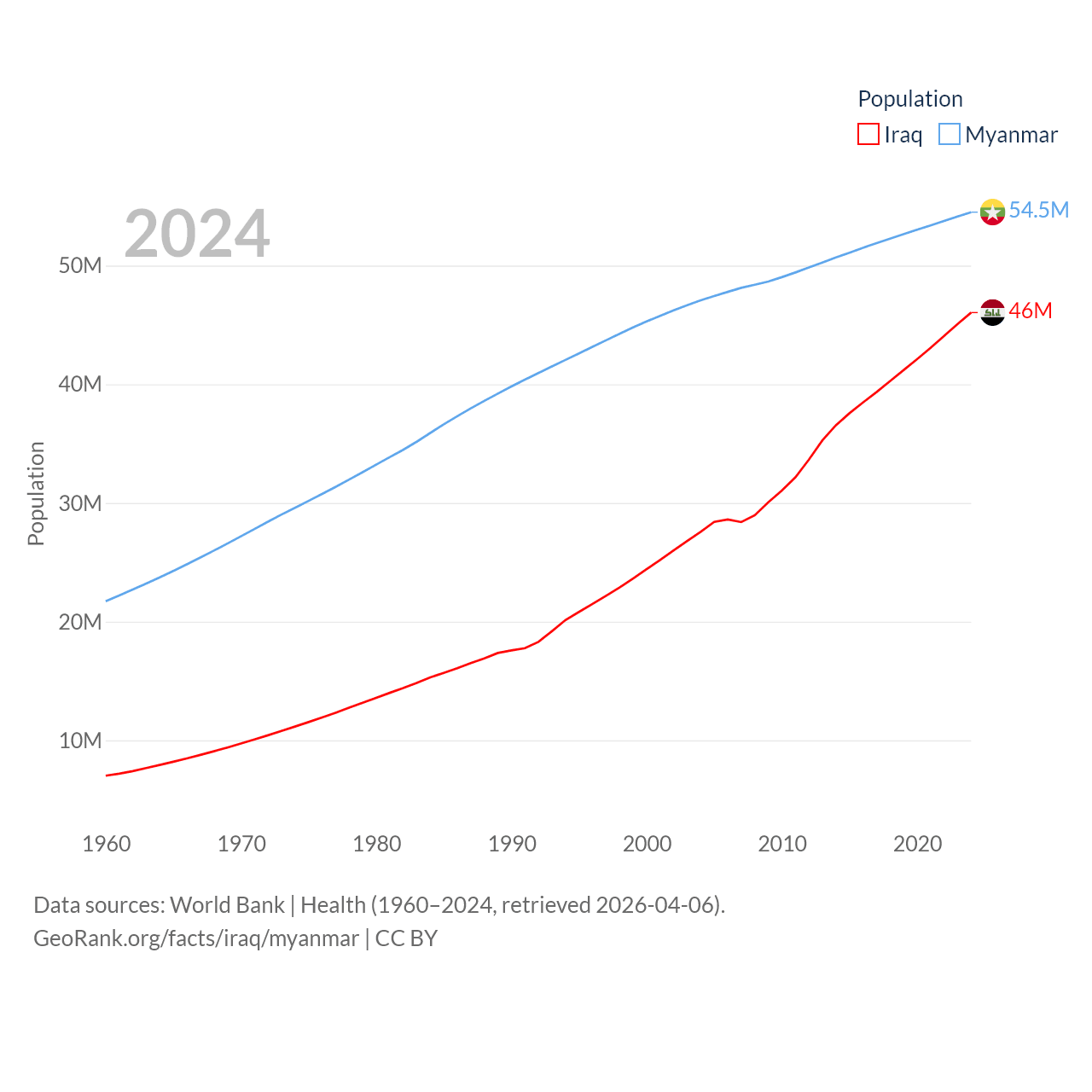 Iraq has a population of 46M (ranked 34/197), compared with 54.5M in Myanmar (ranked 27/197). Iraq's land area is 167,619 sq mi versus 251,997 sq mi for Myanmar (ranked 57th vs. 39th).