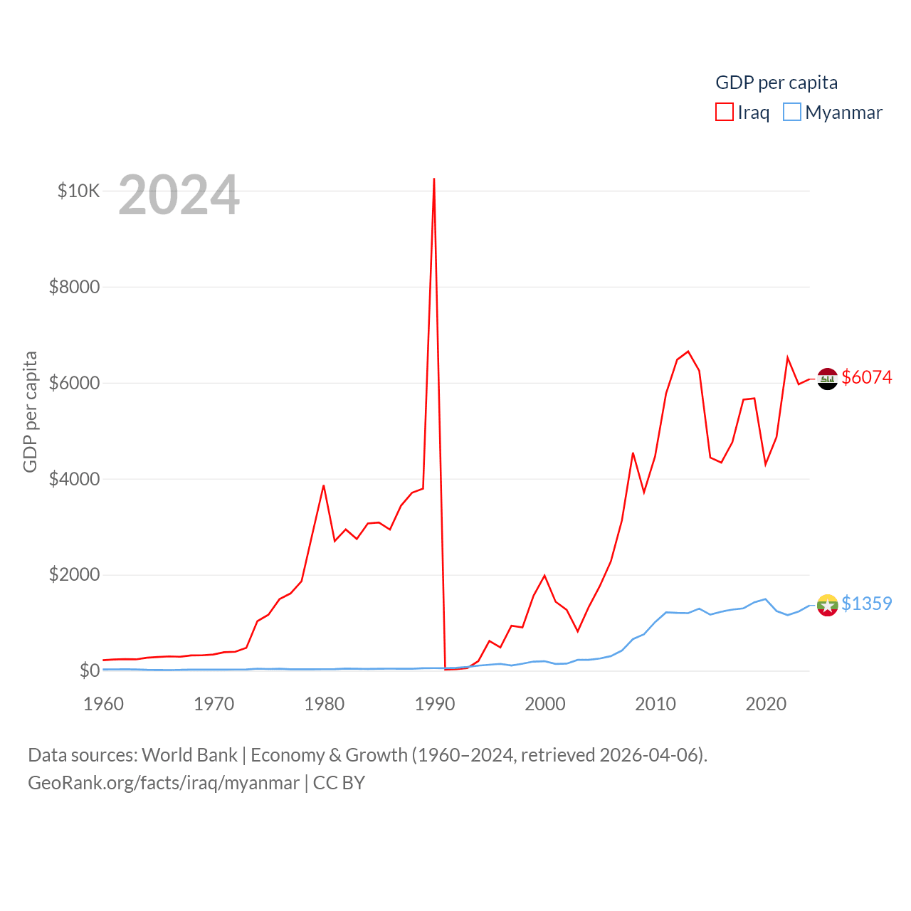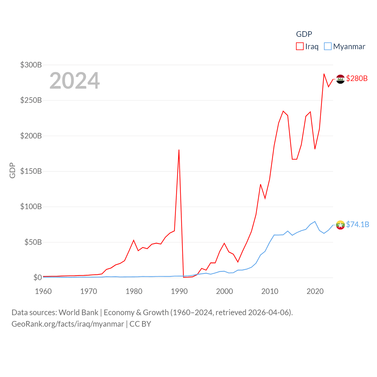 By GDP, Iraq ranks 50/197 ($280B) and Myanmar ranks 85/197 ($74.1B). By GDP per capita, Iraq ranks 113/197 ($6,074), while Myanmar ranks 165/197 ($1,359).