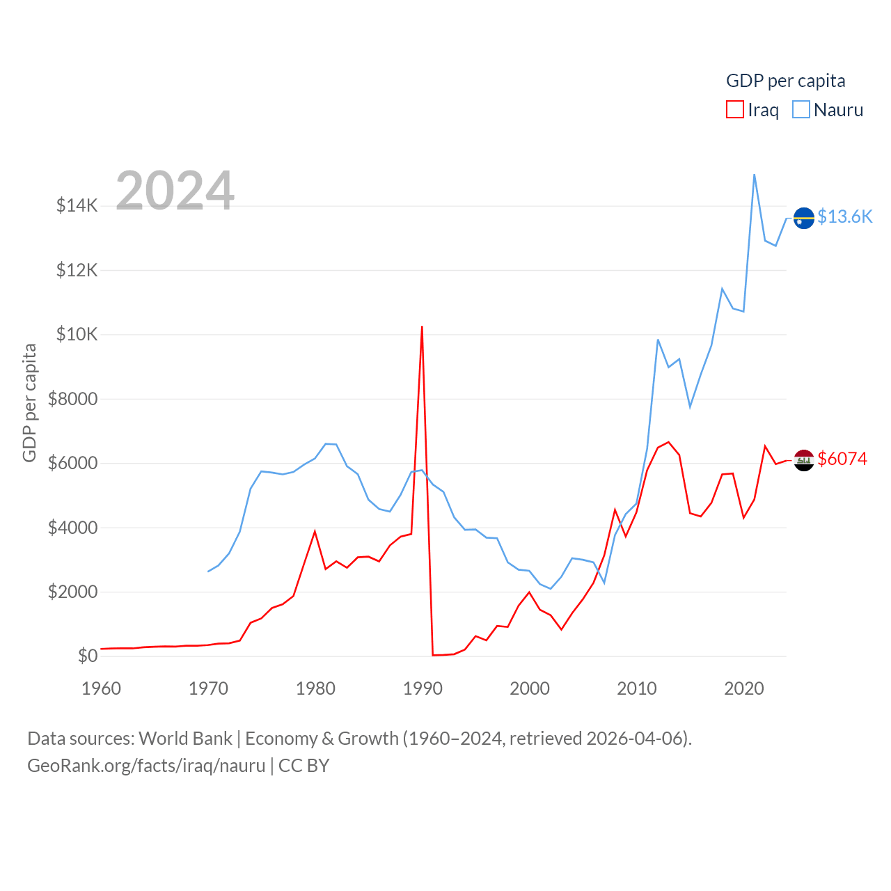By GDP, Iraq ranks 50/197 ($280B) and Nauru ranks 195/197 ($163M). By GDP per capita, Iraq ranks 113/197 ($6,074), while Nauru ranks 74/197 ($13,609).