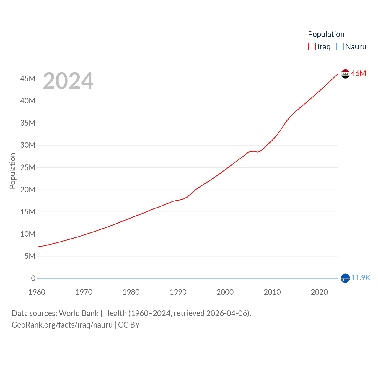Iraq has a population of 46M (ranked 34/197), compared with 11.9K in Nauru (ranked 195/197). Iraq's land area is 167,619 sq mi versus 7.72 sq mi for Nauru (ranked 57th vs. 195th).