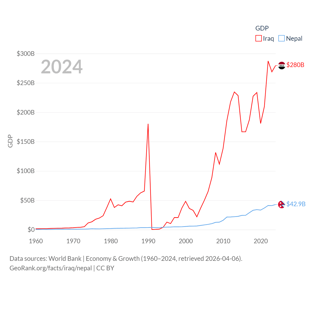 By GDP, Iraq ranks 50/197 ($280B) and Nepal ranks 101/197 ($42.9B). By GDP per capita, Iraq ranks 113/197 ($6,074), while Nepal ranks 164/197 ($1,447).