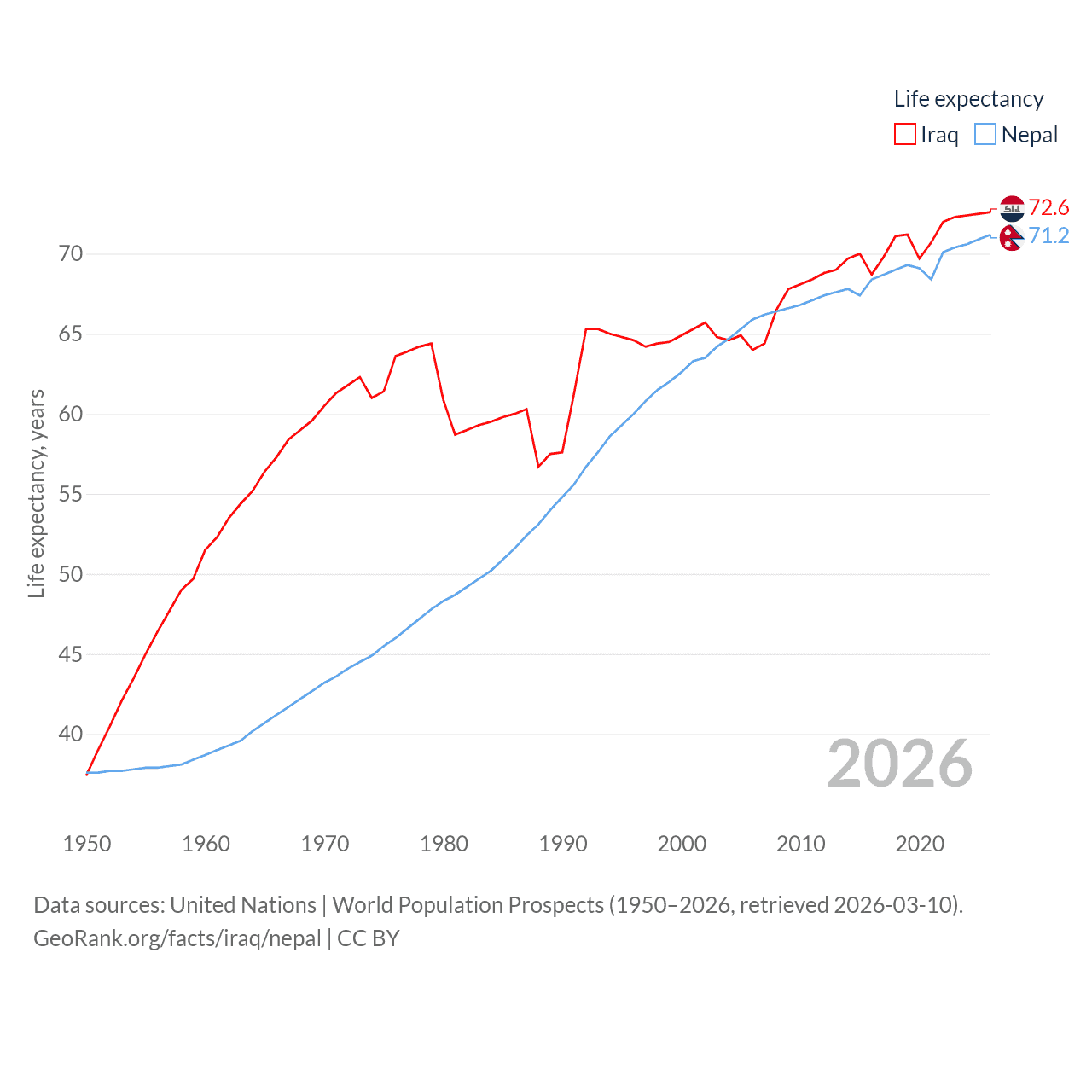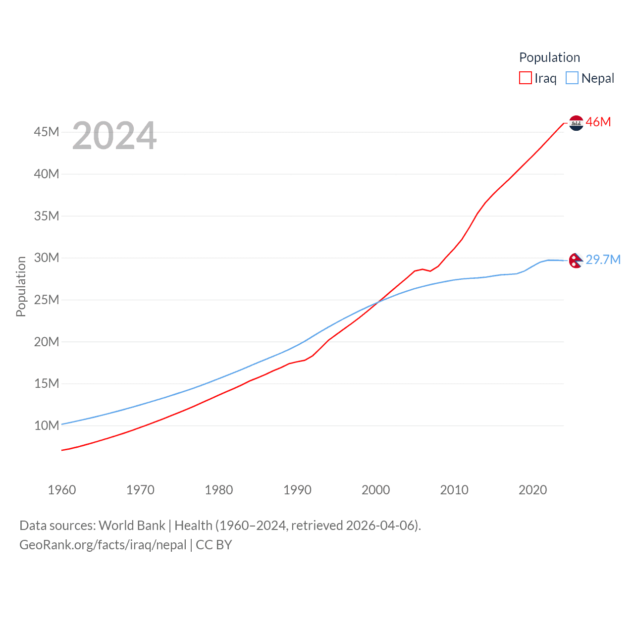 Iraq has a population of 46M (ranked 34/197), compared with 29.7M in Nepal (ranked 51/197). Iraq's land area is 167,619 sq mi versus 55,348 sq mi for Nepal (ranked 57th vs. 92nd).