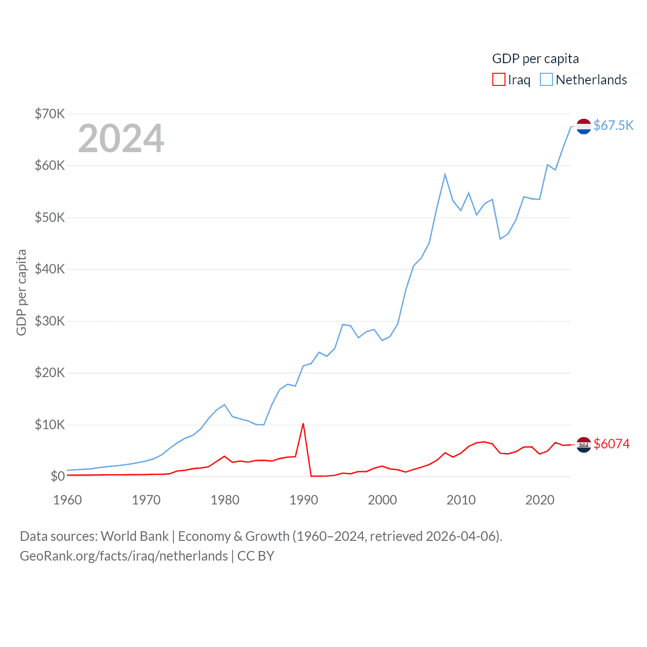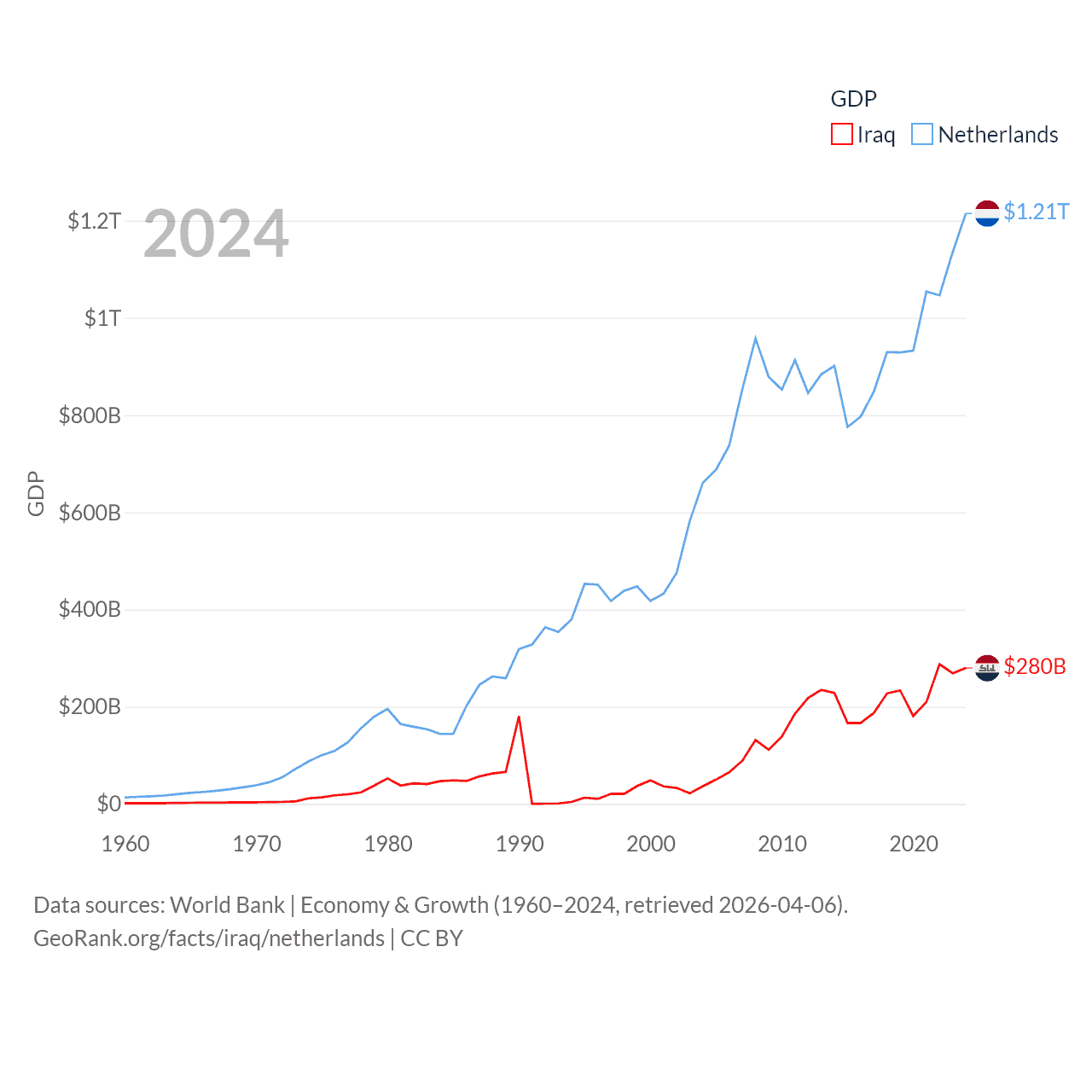 By GDP, Iraq ranks 50/197 ($280B) and The Netherlands ranks 19/197 ($1.21T). By GDP per capita, Iraq ranks 113/197 ($6,074), while The Netherlands ranks 13/197 ($67,520).