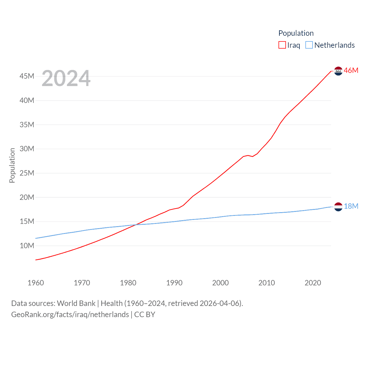 Iraq has a population of 46M (ranked 34/197), compared with 18M in The Netherlands (ranked 72/197). Iraq's land area is 167,619 sq mi versus 13,000 sq mi for The Netherlands (ranked 57th vs. 134th).