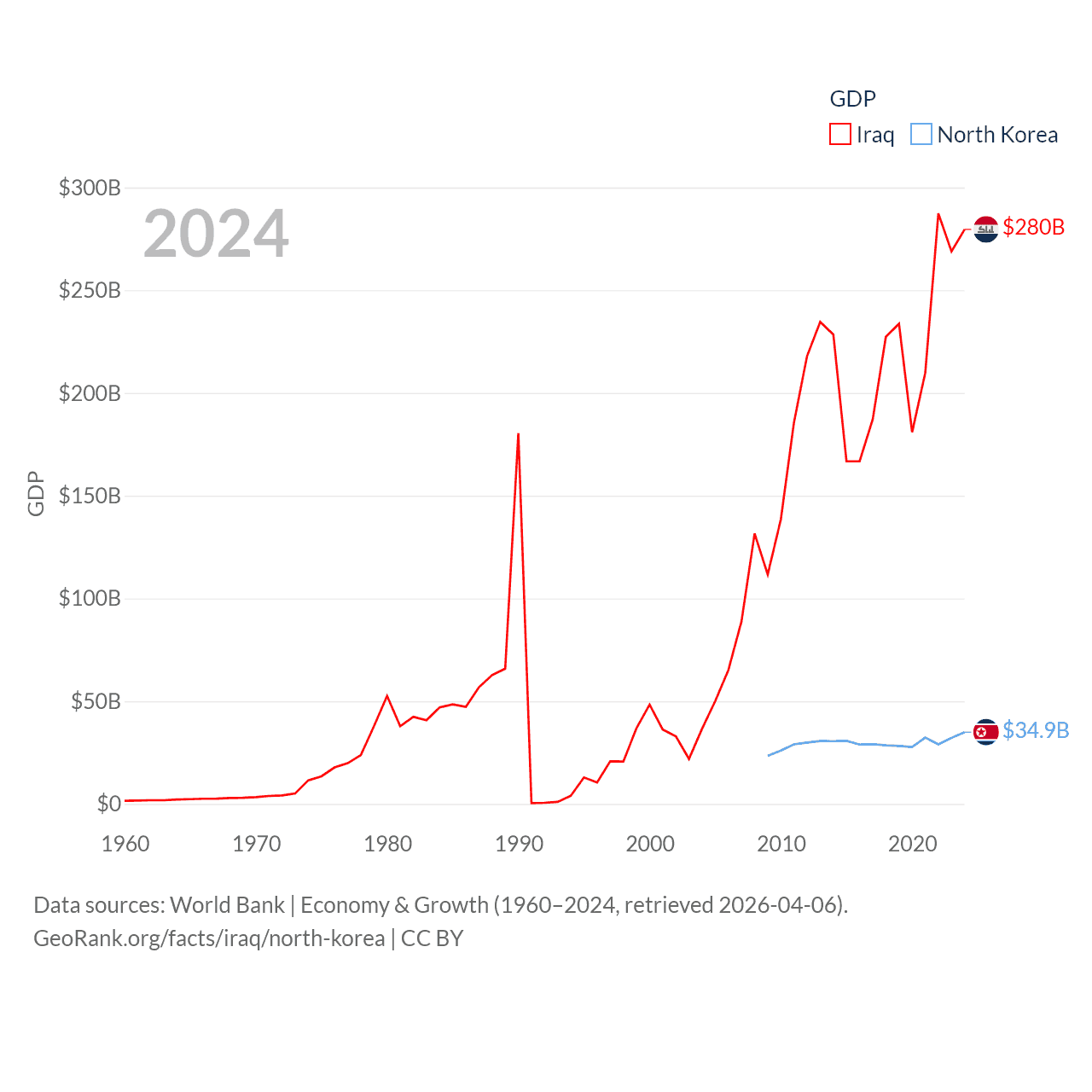 By GDP, Iraq ranks 50/197 ($280B) and North Korea ranks 106/197 ($34.9B). By GDP per capita, Iraq ranks 113/197 ($6,074), while North Korea ranks 168/197 ($1,319).