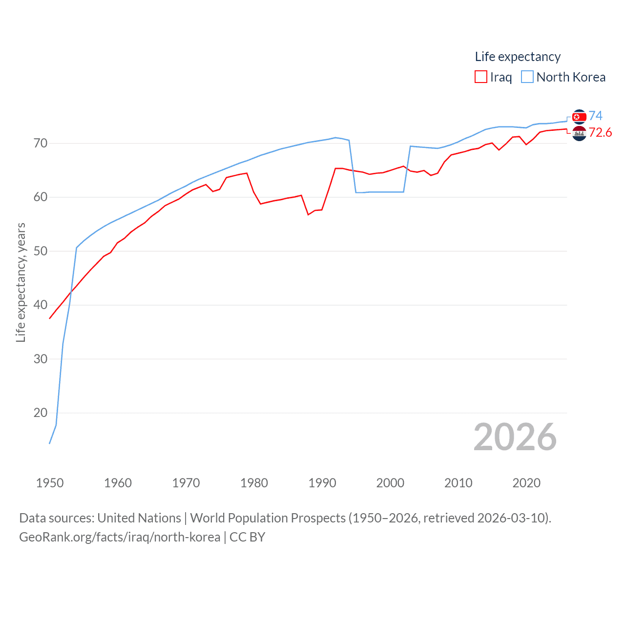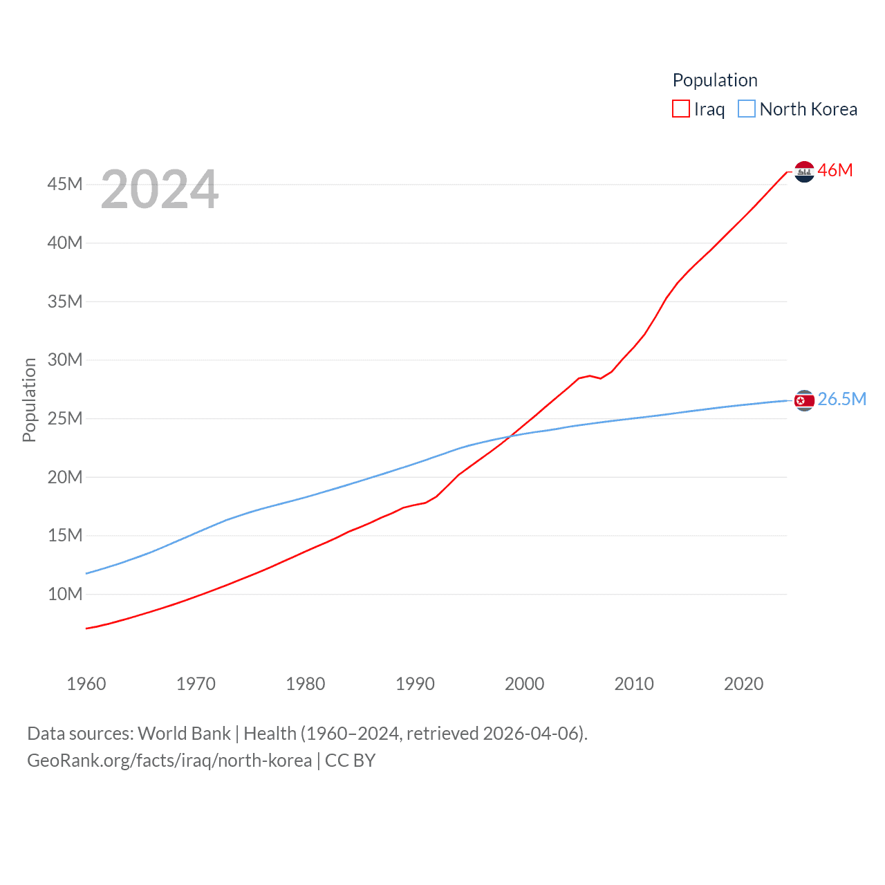 Iraq has a population of 46M (ranked 34/197), compared with 26.5M in North Korea (ranked 56/197). Iraq's land area is 167,619 sq mi versus 46,491 sq mi for North Korea (ranked 57th vs. 97th).