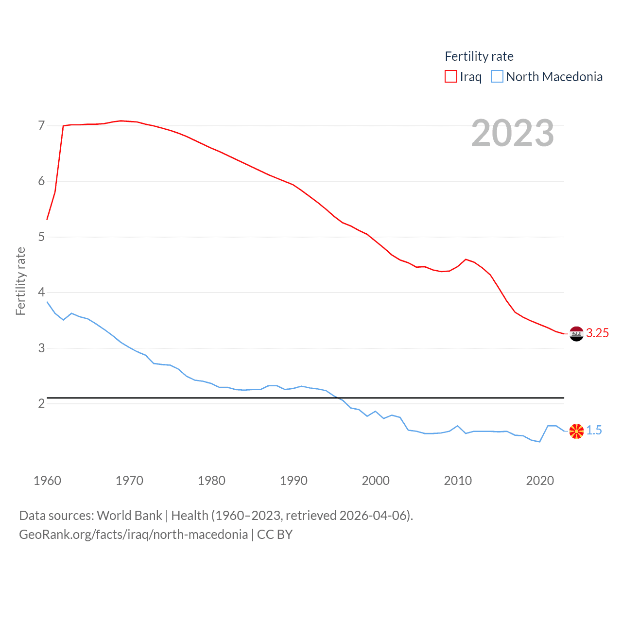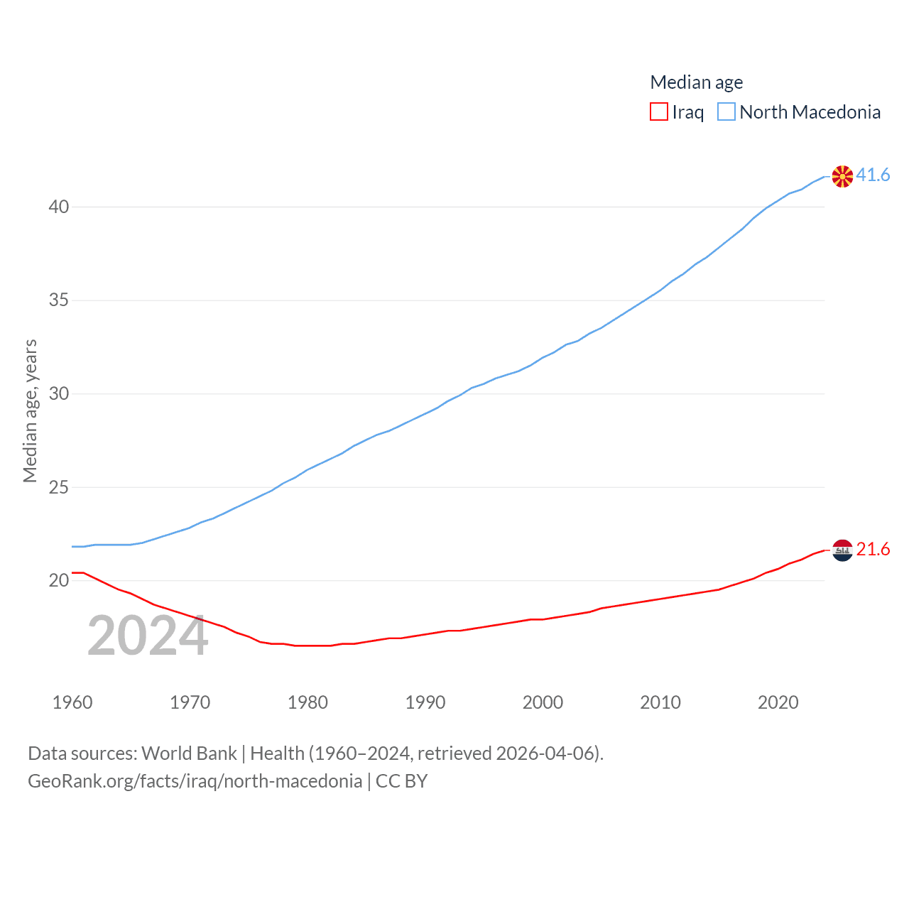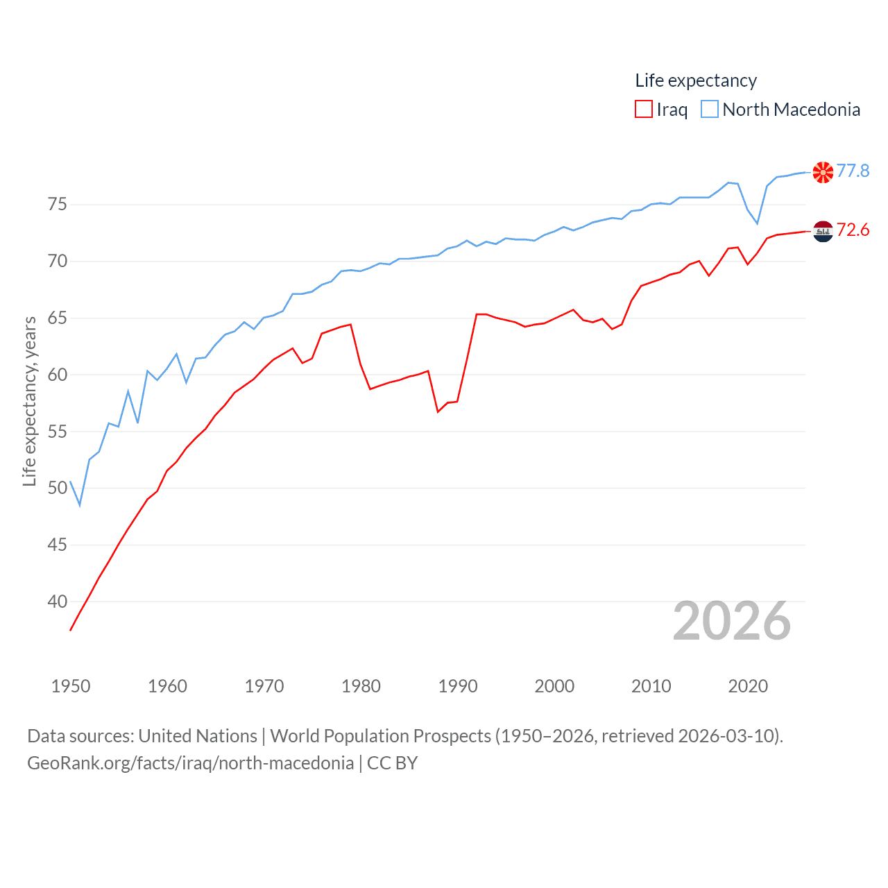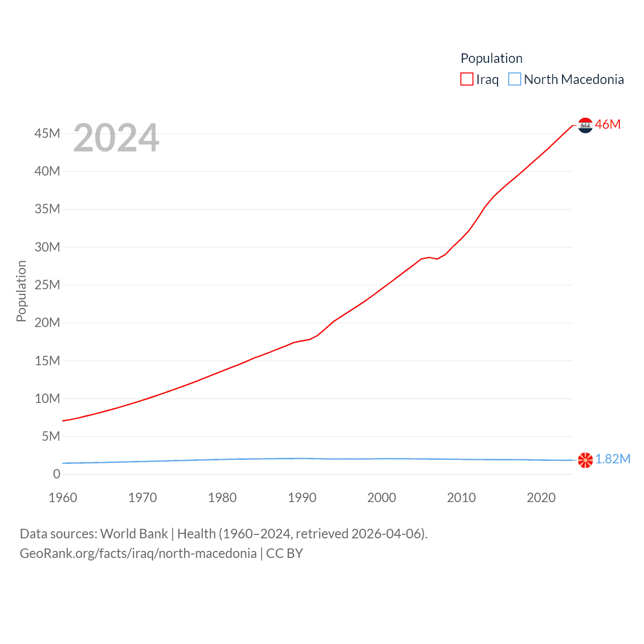 Iraq has a population of 46M (ranked 34/197), compared with 1.82M in North Macedonia (ranked 150/197). Iraq's land area is 167,619 sq mi versus 9,737 sq mi for North Macedonia (ranked 57th vs. 145th).
