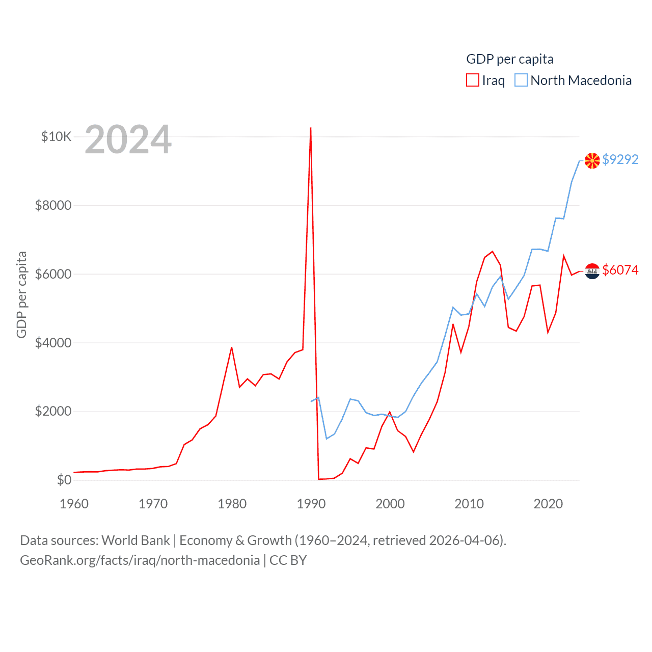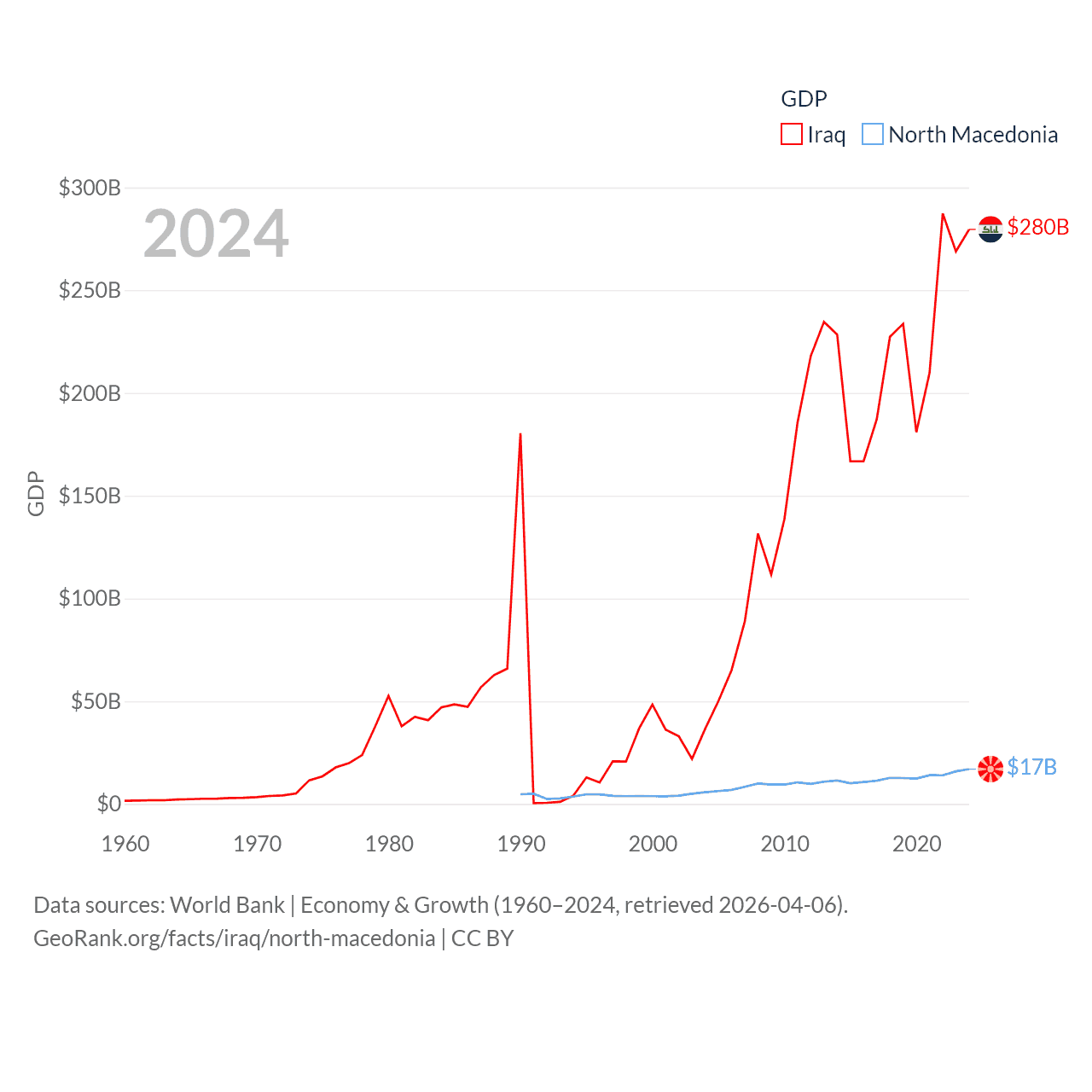 By GDP, Iraq ranks 50/197 ($280B) and North Macedonia ranks 138/197 ($17B). By GDP per capita, Iraq ranks 113/197 ($6,074), while North Macedonia ranks 88/197 ($9,292).