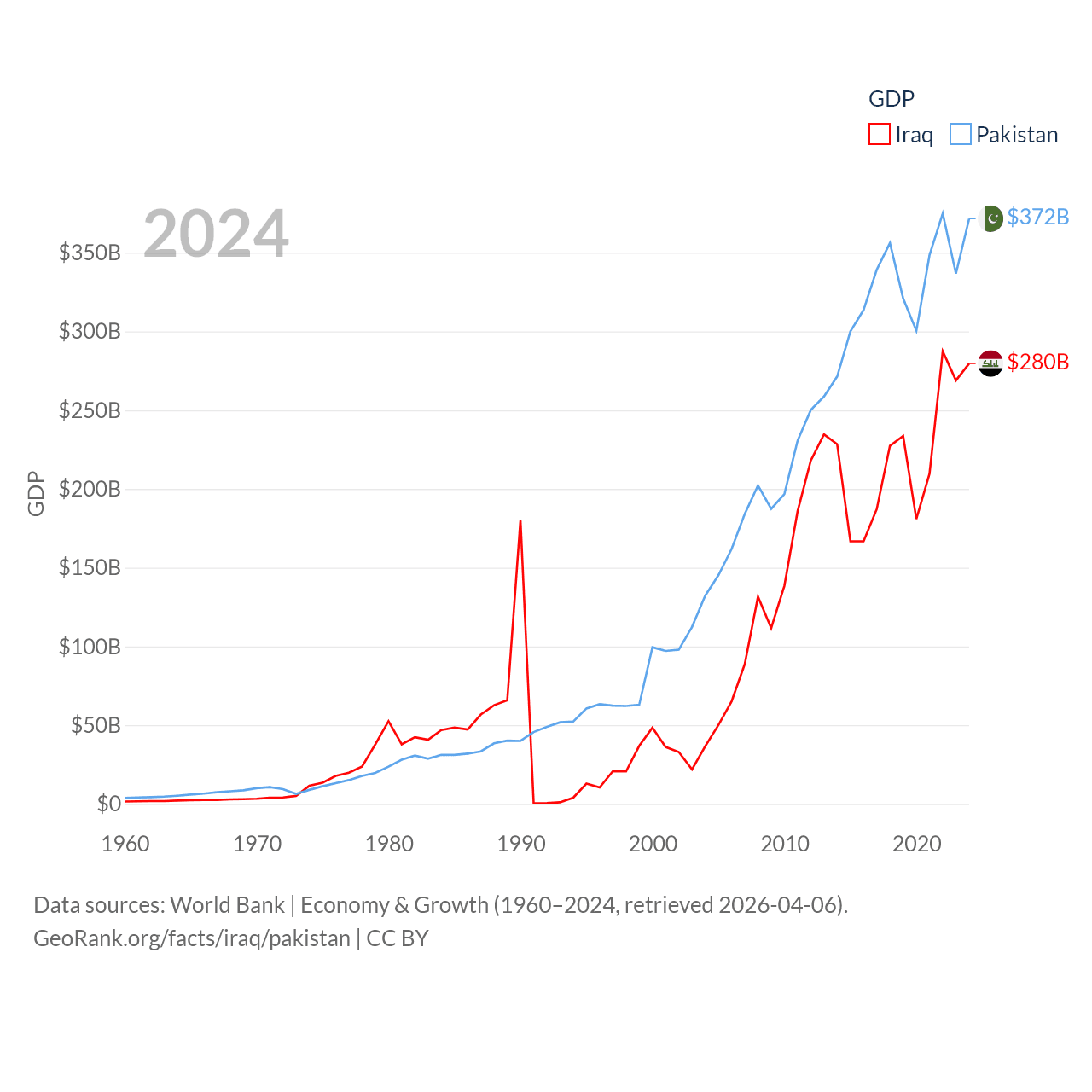 By GDP, Iraq ranks 50/197 ($280B) and Pakistan ranks 43/197 ($372B). By GDP per capita, Iraq ranks 113/197 ($6,074), while Pakistan ranks 163/197 ($1,479).