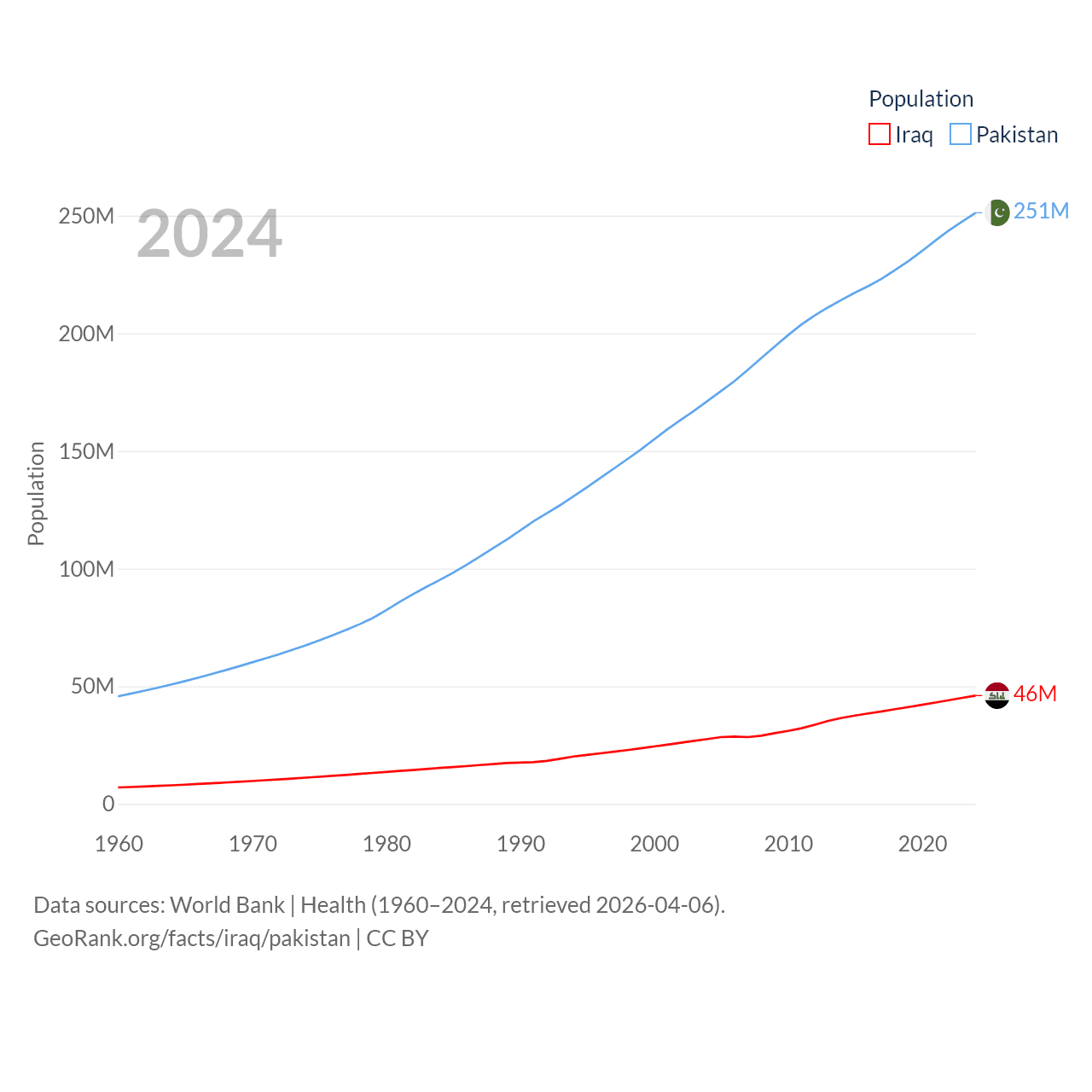 Iraq has a population of 46M (ranked 34/197), compared with 251M in Pakistan (ranked 5/197). Iraq's land area is 167,619 sq mi versus 297,638 sq mi for Pakistan (ranked 57th vs. 35th).