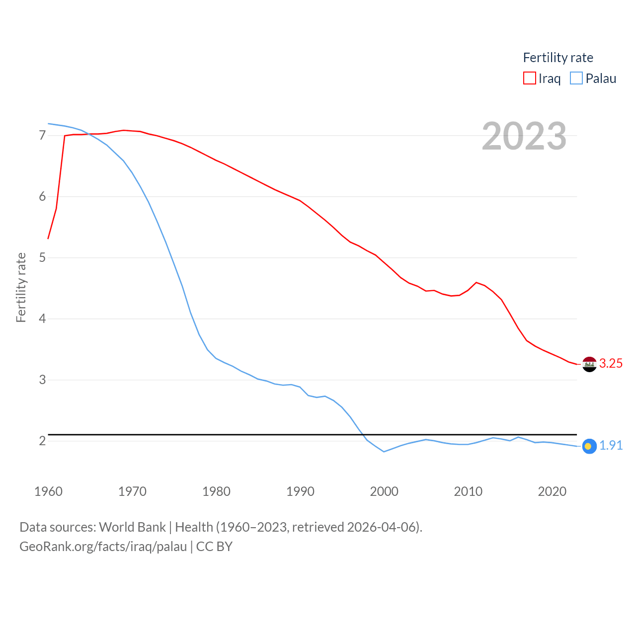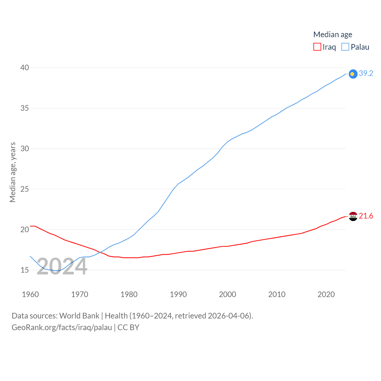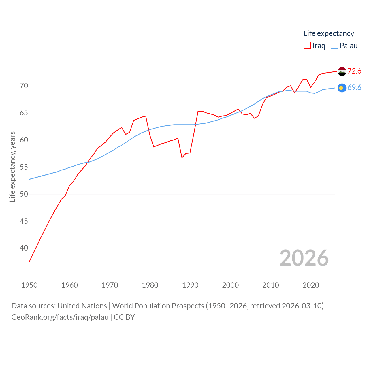 Iraq has a population of 46M (ranked 34/197), compared with 17.7K in Palau (ranked 194/197). Iraq's land area is 167,619 sq mi versus 177.6 sq mi for Palau (ranked 57th vs. 180th).