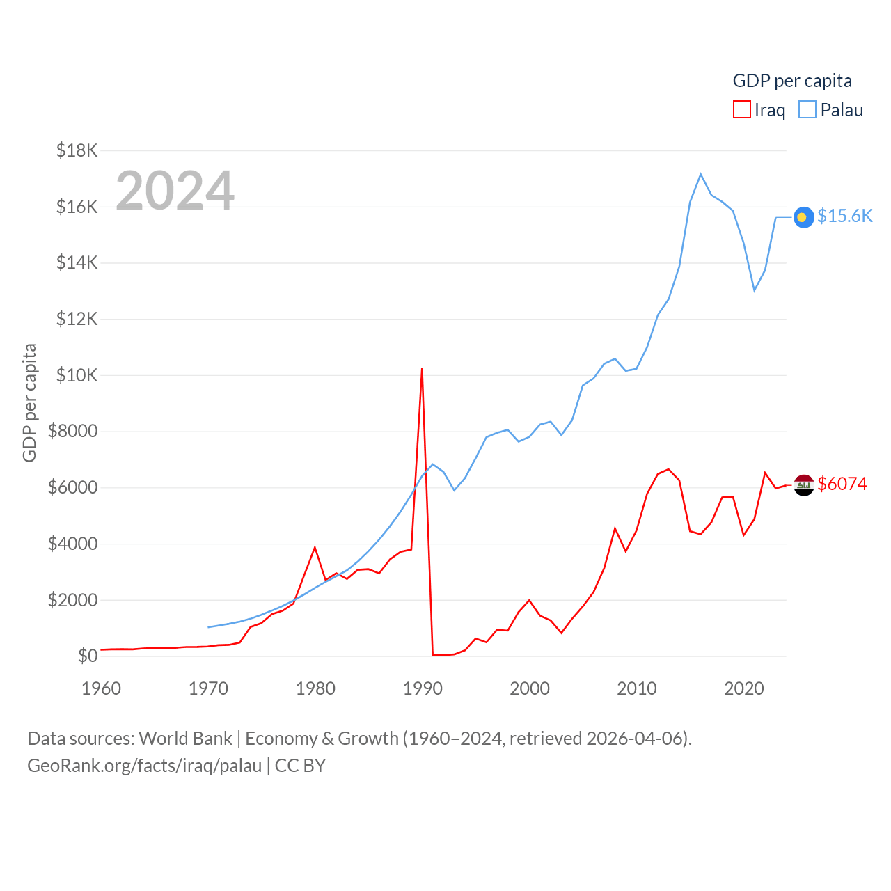 By GDP, Iraq ranks 50/197 ($280B) and Palau ranks 194/197 ($277M). By GDP per capita, Iraq ranks 113/197 ($6,074), while Palau ranks 67/197 ($15,611).