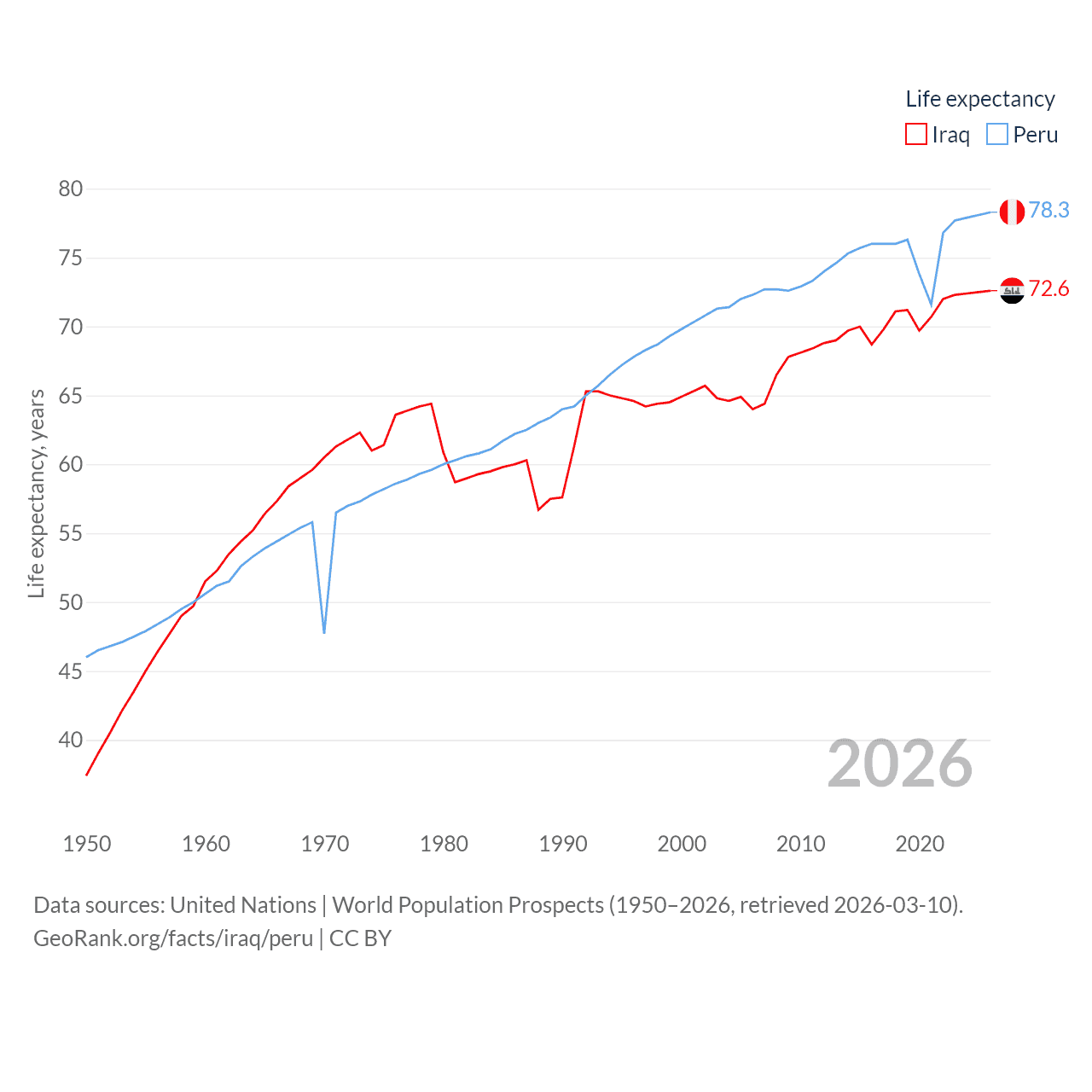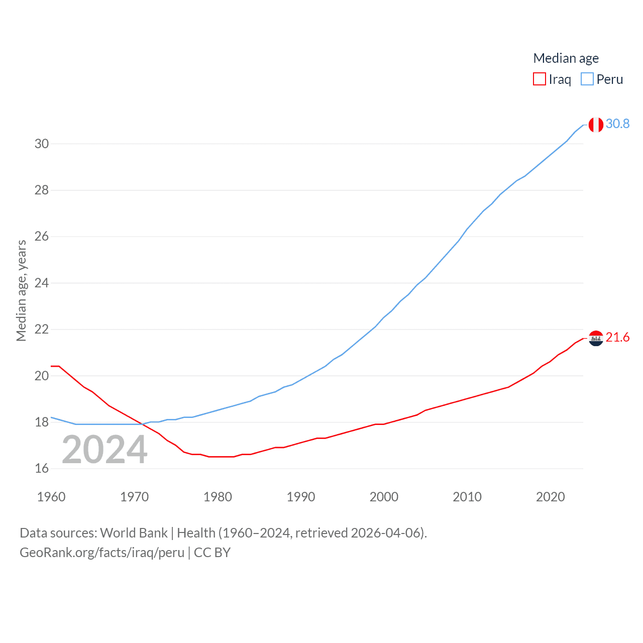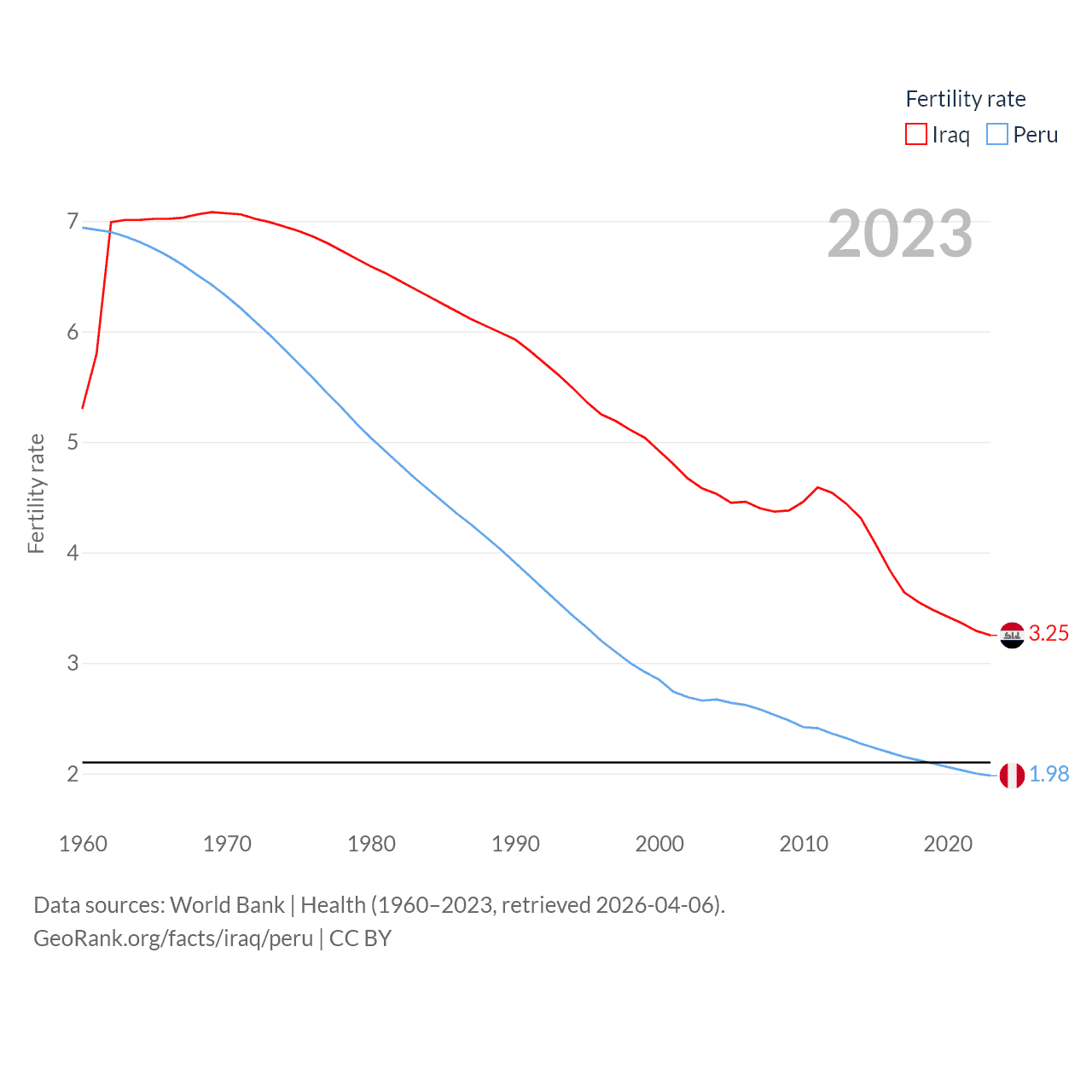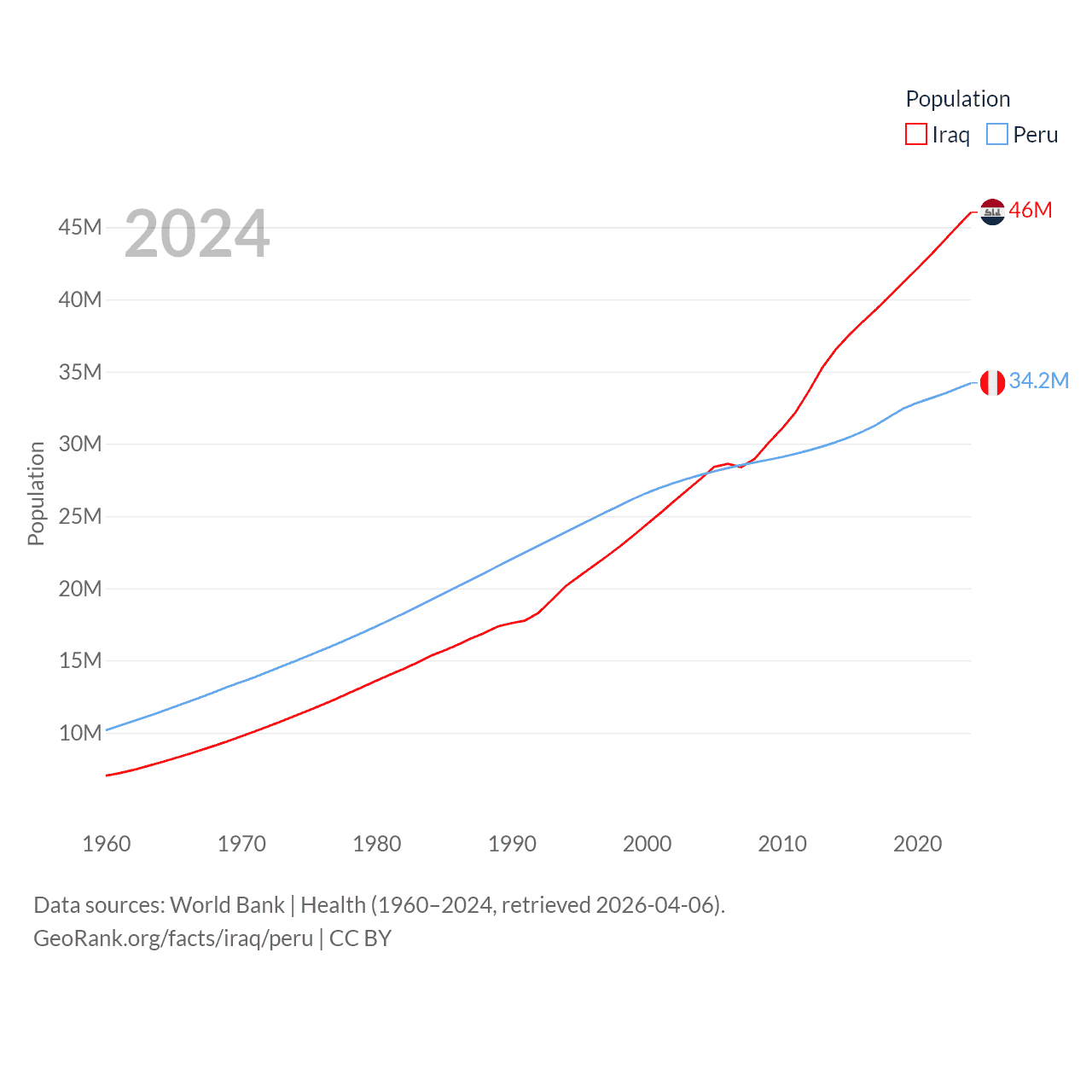Iraq has a population of 46M (ranked 34/197), compared with 34.2M in Peru (ranked 48/197). Iraq's land area is 167,619 sq mi versus 494,211 sq mi for Peru (ranked 57th vs. 19th).