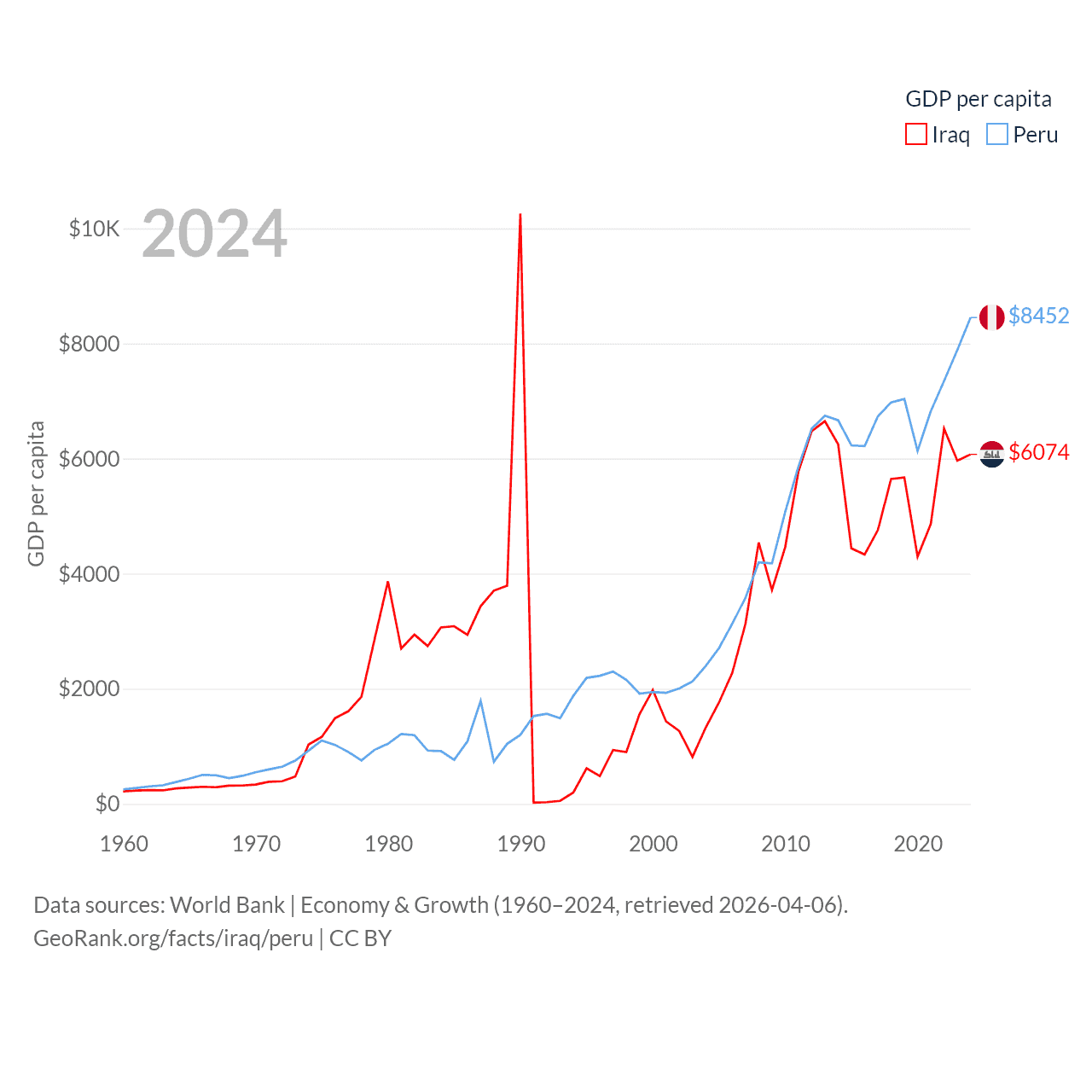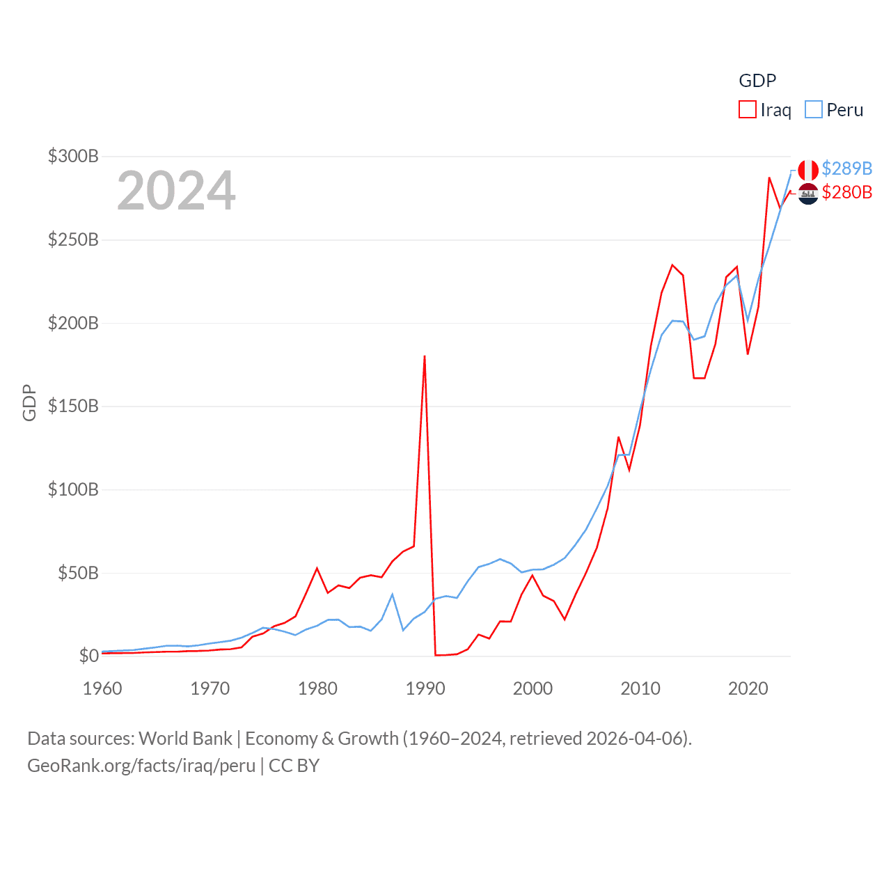 By GDP, Iraq ranks 50/197 ($280B) and Peru ranks 49/197 ($289B). By GDP per capita, Iraq ranks 113/197 ($6,074), while Peru ranks 91/197 ($8,452).