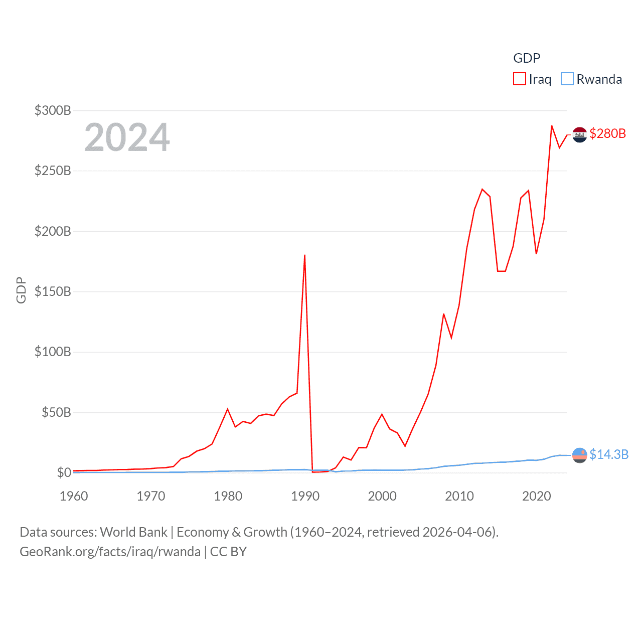 By GDP, Iraq ranks 50/197 ($280B) and Rwanda ranks 144/197 ($14.3B). By GDP per capita, Iraq ranks 113/197 ($6,074), while Rwanda ranks 178/197 ($1,000).
