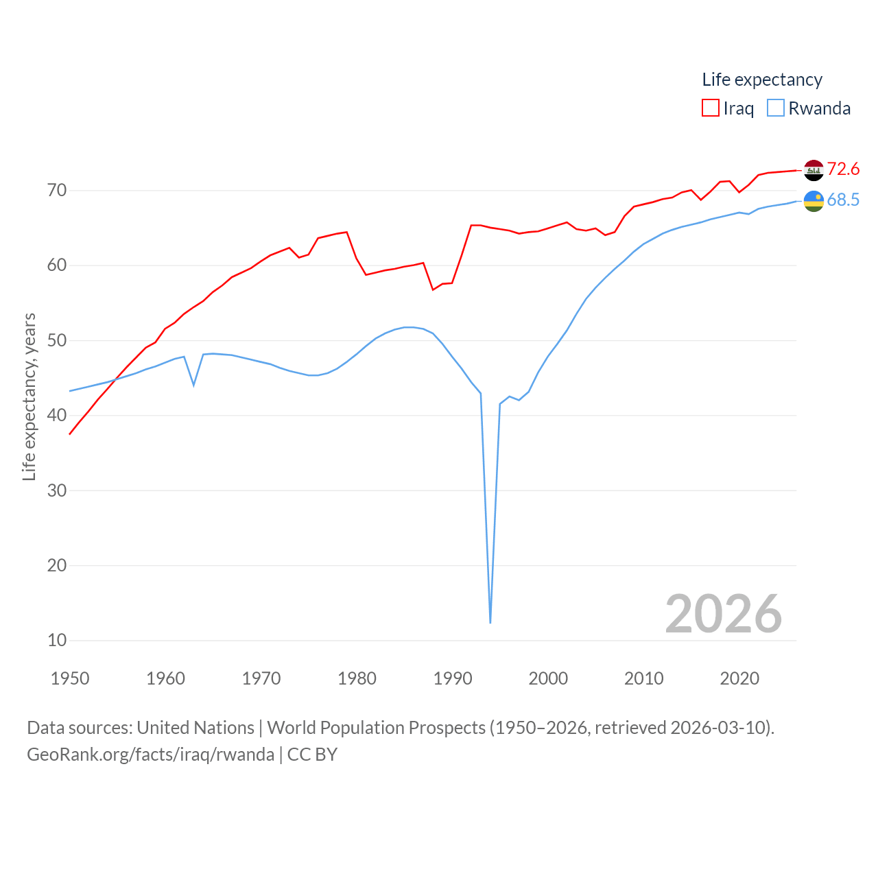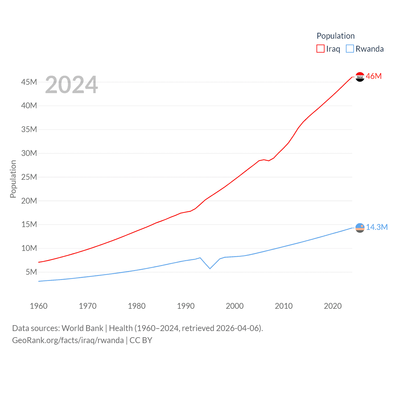 Iraq has a population of 46M (ranked 34/197), compared with 14.3M in Rwanda (ranked 77/197). Iraq's land area is 167,619 sq mi versus 9,525 sq mi for Rwanda (ranked 57th vs. 146th).