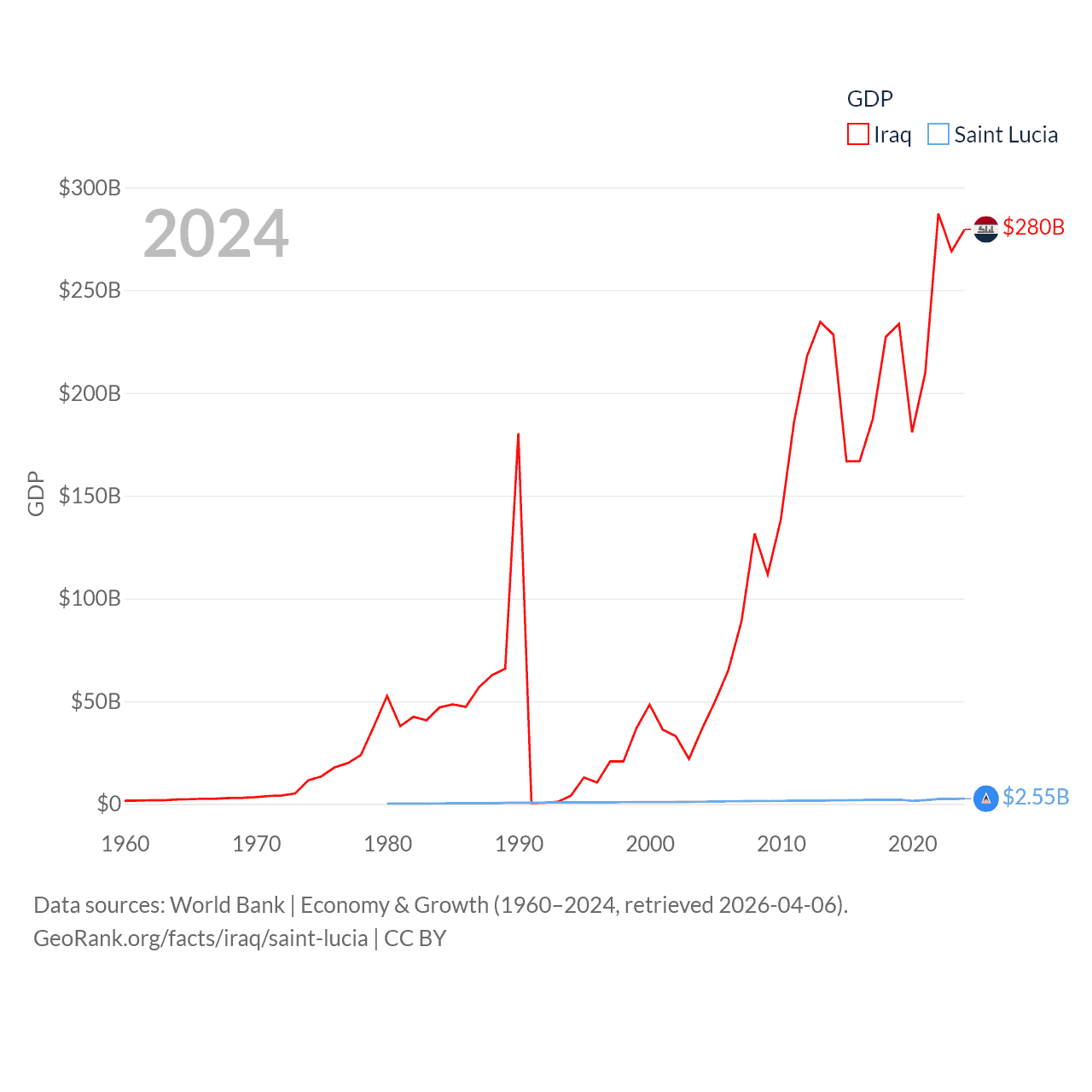 By GDP, Iraq ranks 50/197 ($280B) and Saint Lucia ranks 173/197 ($2.55B). By GDP per capita, Iraq ranks 113/197 ($6,074), while Saint Lucia ranks 70/197 ($14,182).