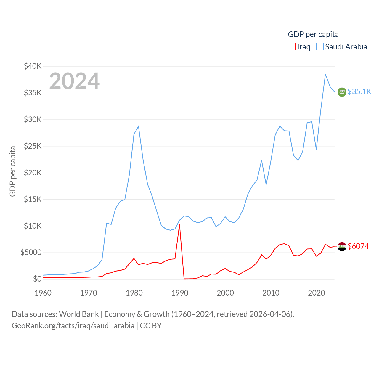 By GDP, Iraq ranks 50/197 ($280B) and Saudi Arabia ranks 18/197 ($1.24T). By GDP per capita, Iraq ranks 113/197 ($6,074), while Saudi Arabia ranks 33/197 ($35,122).
