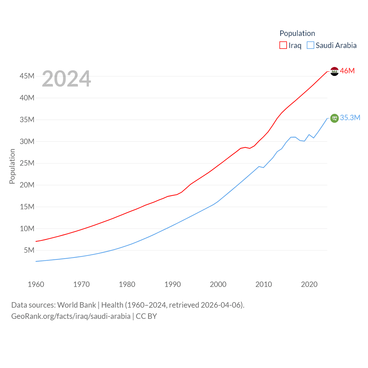 Iraq has a population of 46M (ranked 34/197), compared with 35.3M in Saudi Arabia (ranked 45/197). Iraq's land area is 167,619 sq mi versus 830,000 sq mi for Saudi Arabia (ranked 57th vs. 12th).