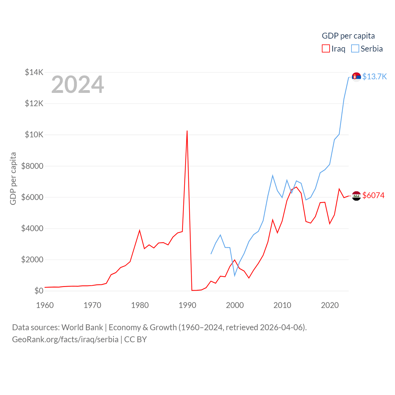 By GDP, Iraq ranks 50/197 ($280B) and Serbia ranks 76/197 ($90.1B). By GDP per capita, Iraq ranks 113/197 ($6,074), while Serbia ranks 73/197 ($13,679).