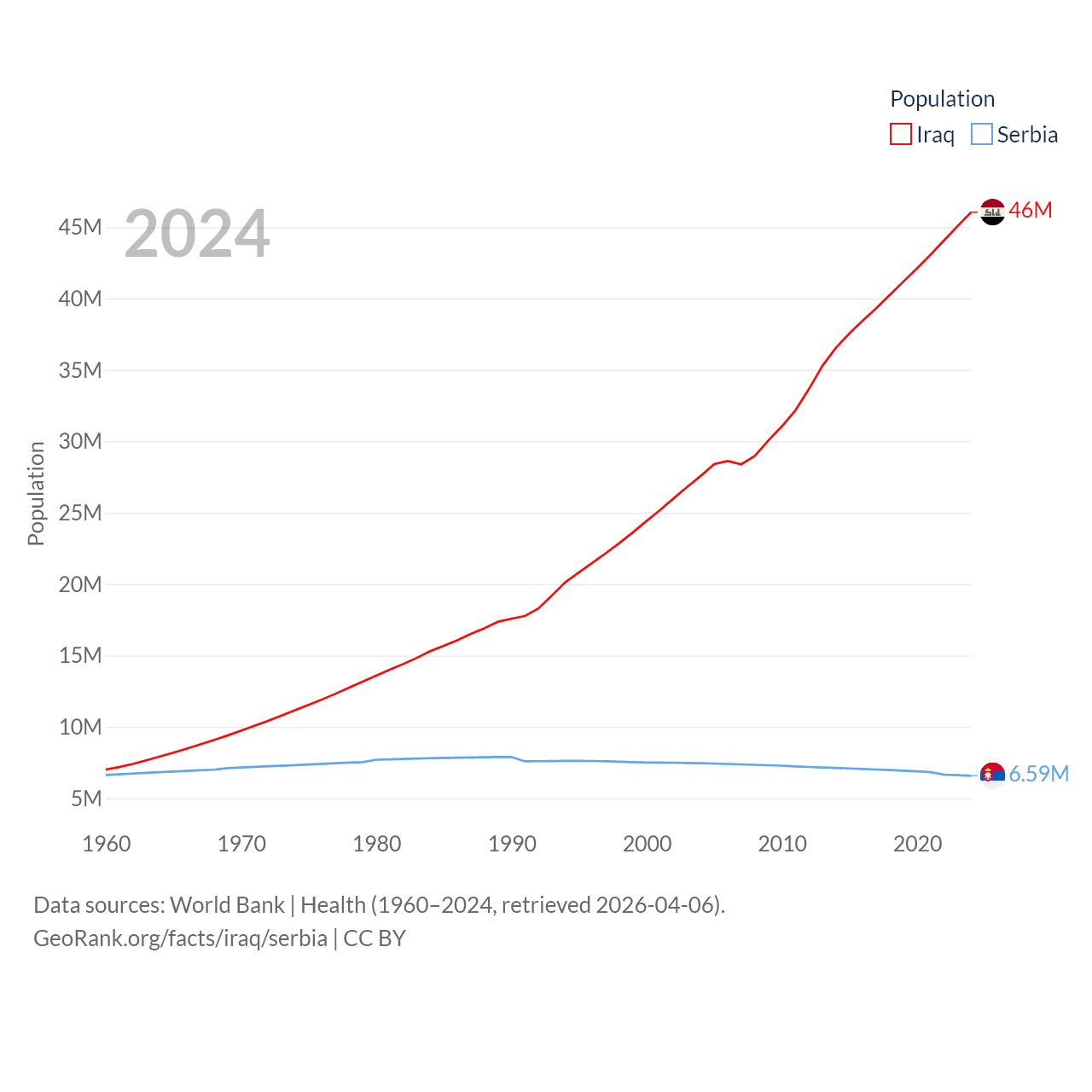 Iraq has a population of 46M (ranked 34/197), compared with 6.59M in Serbia (ranked 109/197). Iraq's land area is 167,619 sq mi versus 32,467 sq mi for Serbia (ranked 57th vs. 111th).
