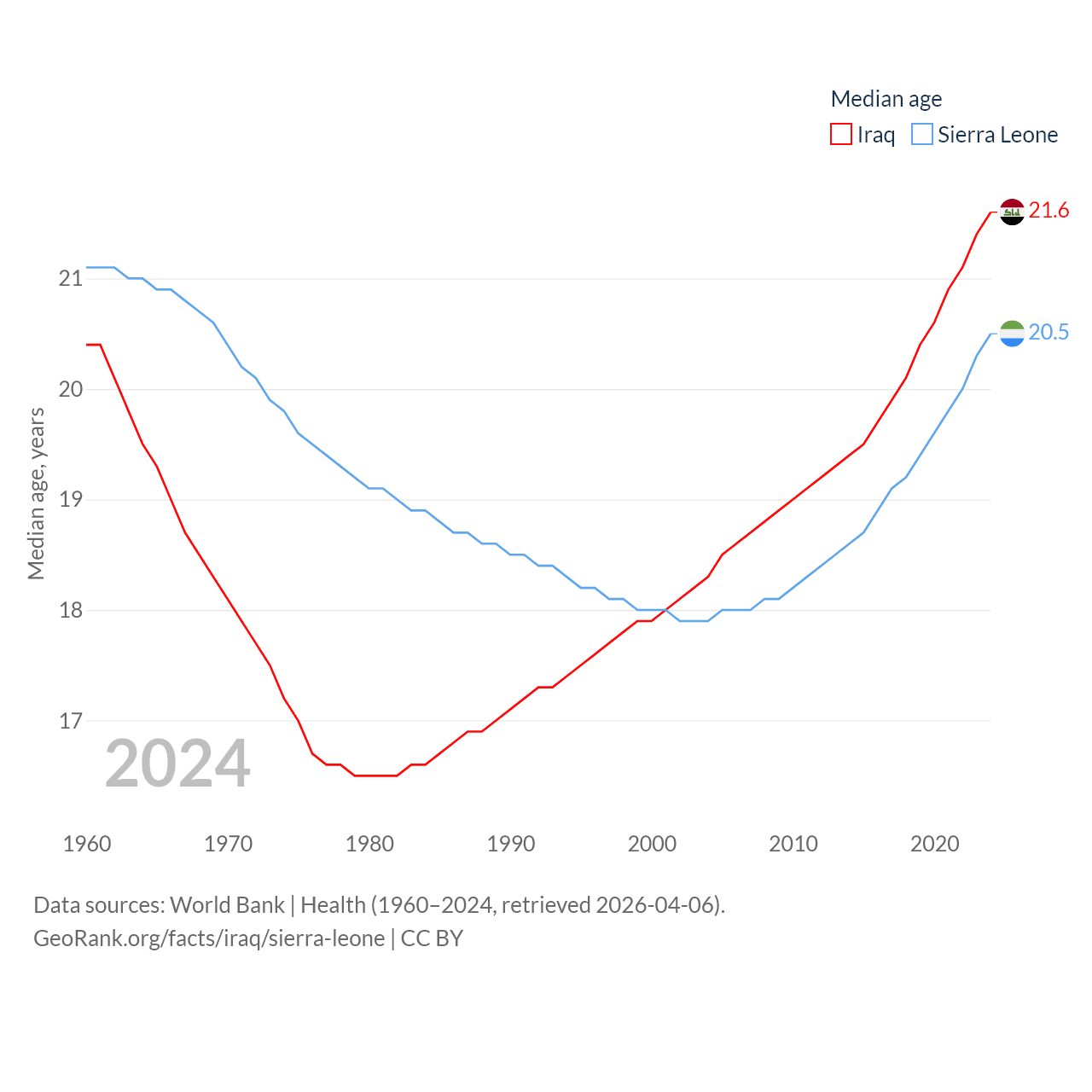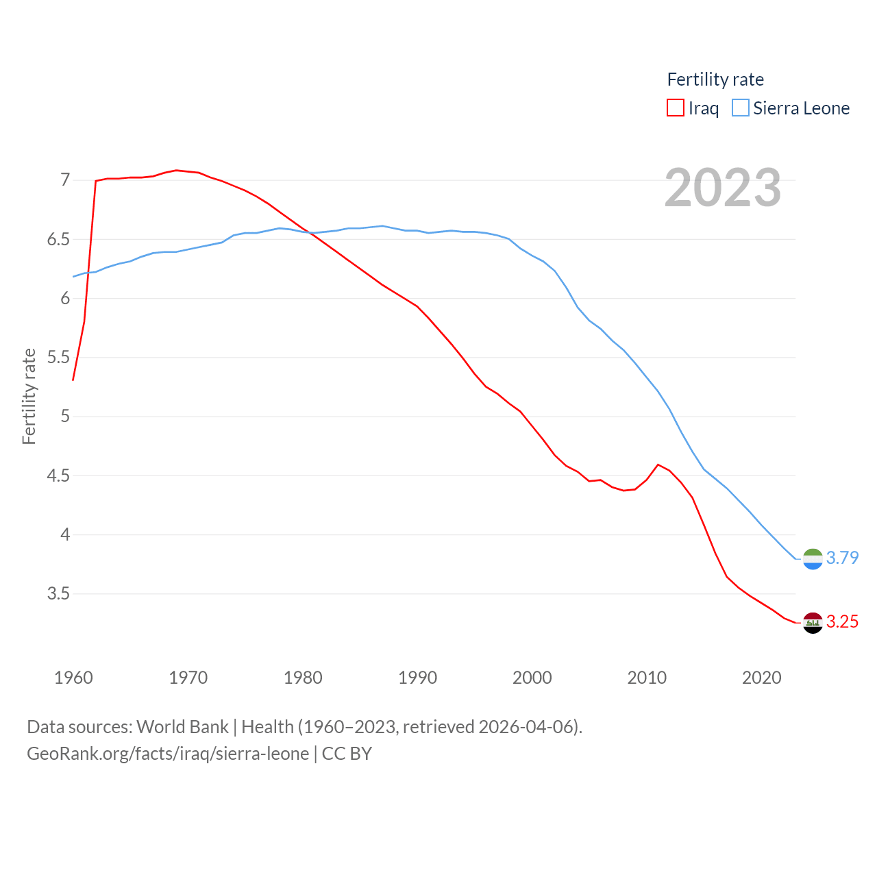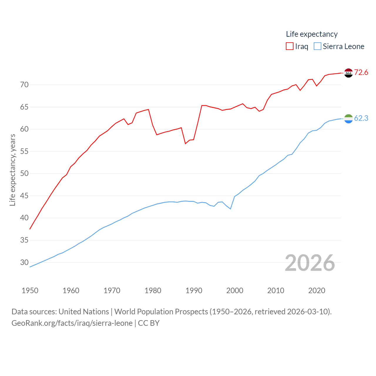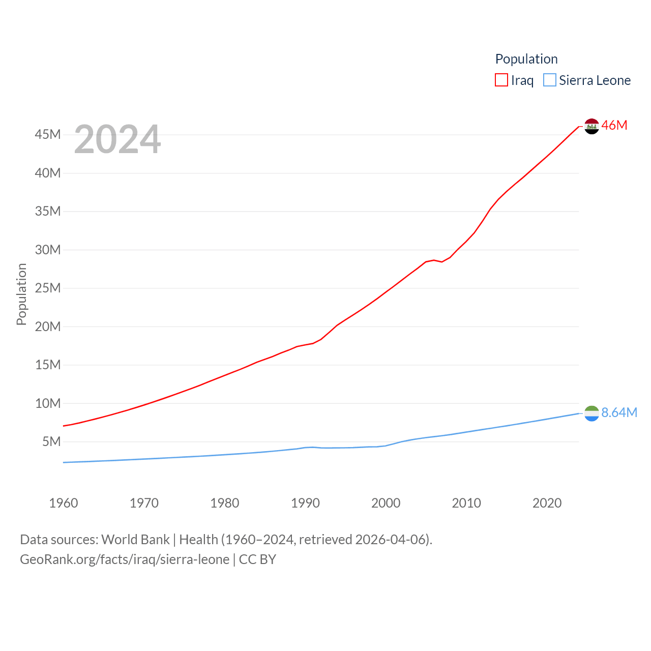 Iraq has a population of 46M (ranked 34/197), compared with 8.64M in Sierra Leone (ranked 102/197). Iraq's land area is 167,619 sq mi versus 27,869 sq mi for Sierra Leone (ranked 57th vs. 116th).