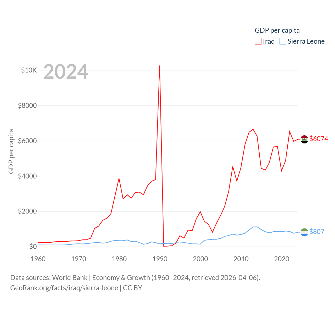 By GDP, Iraq ranks 50/197 ($280B) and Sierra Leone ranks 160/197 ($6.97B). By GDP per capita, Iraq ranks 113/197 ($6,074), while Sierra Leone ranks 186/197 ($807).