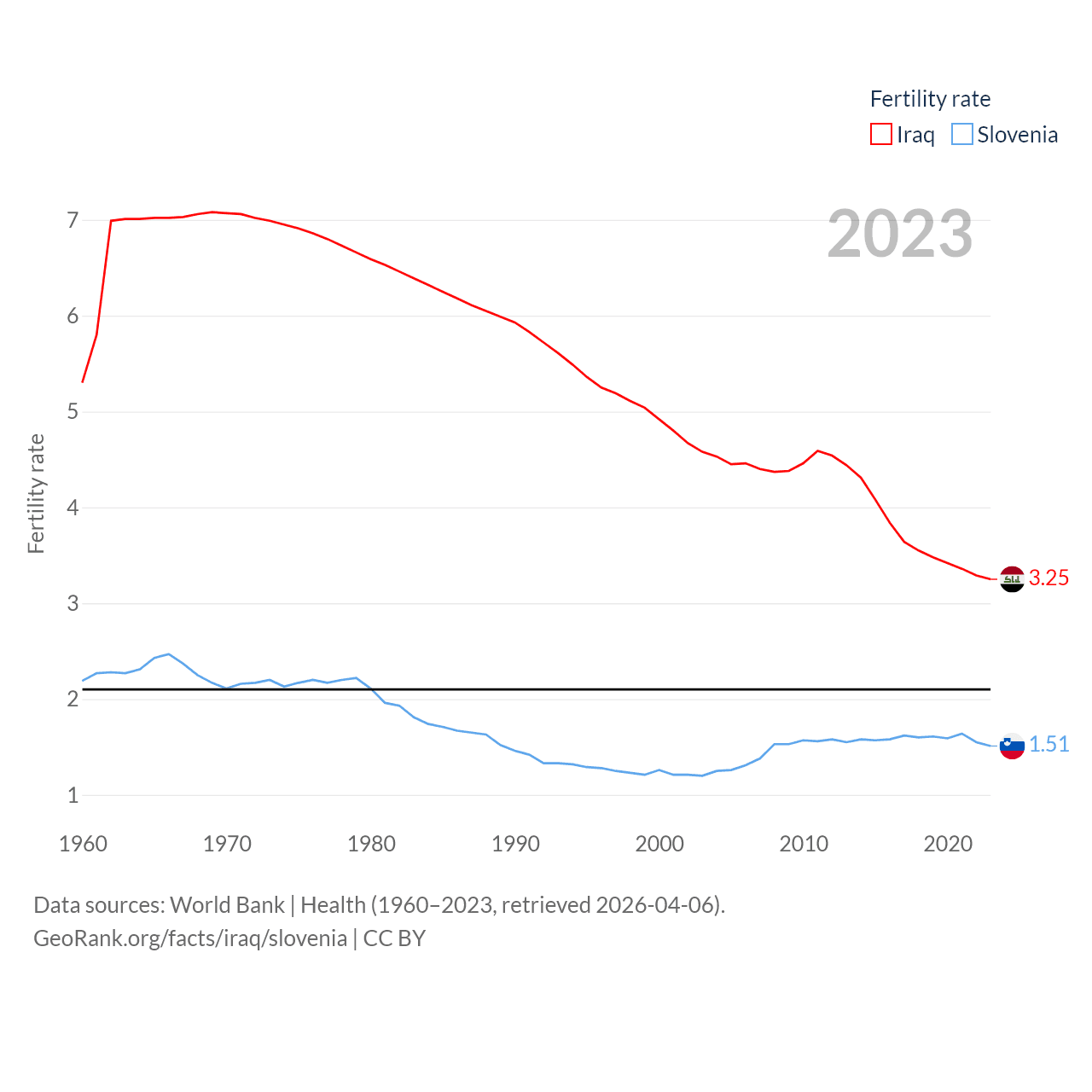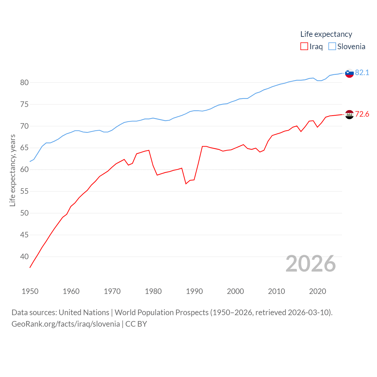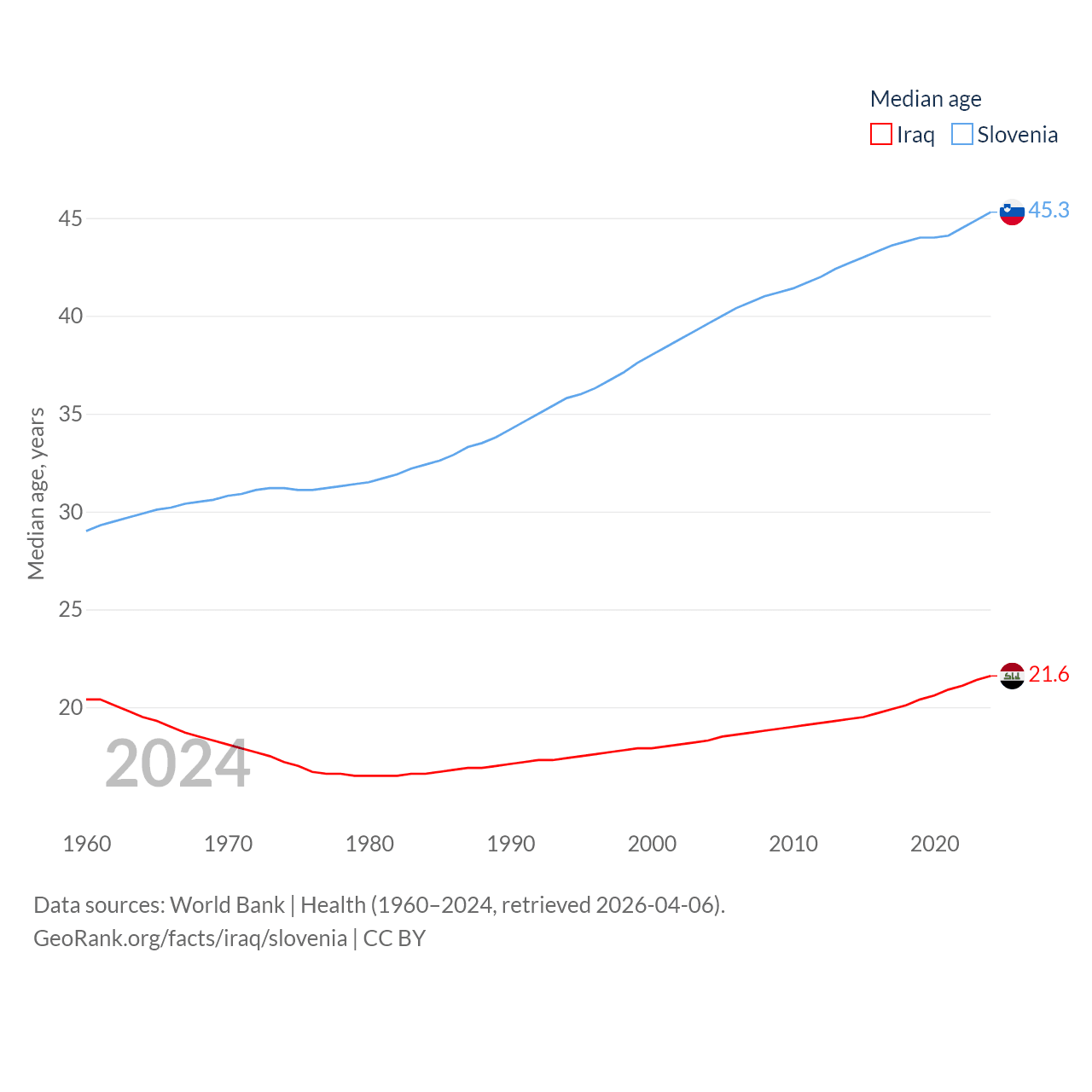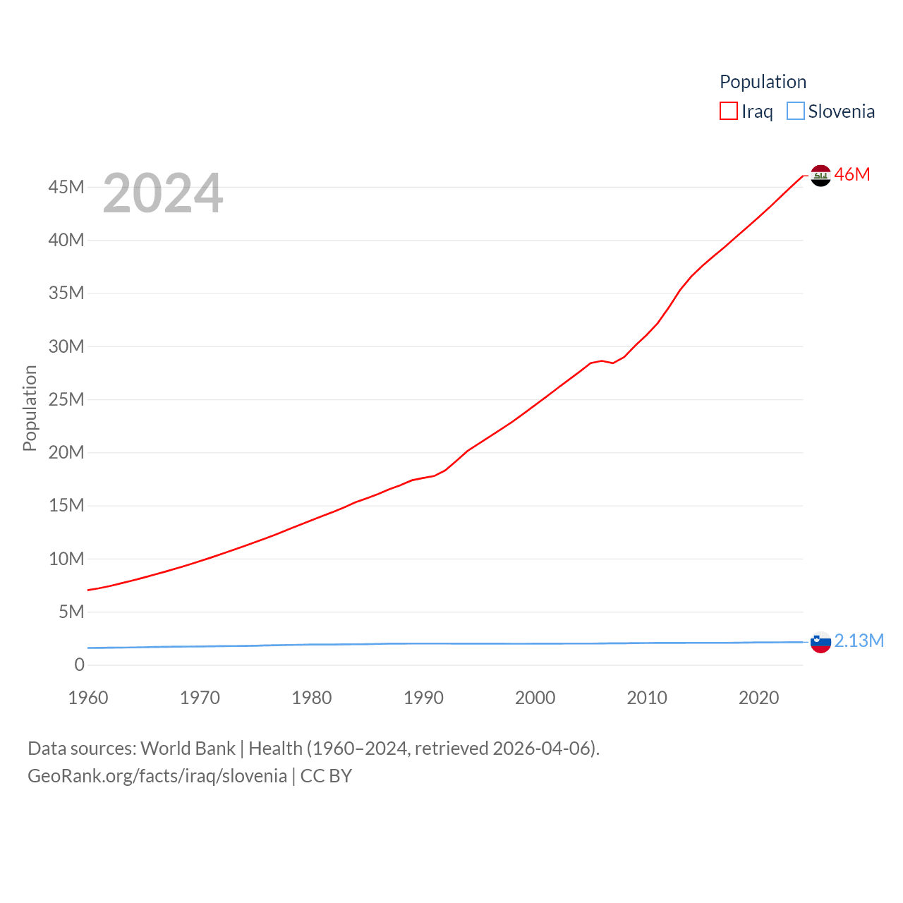 Iraq has a population of 46M (ranked 34/197), compared with 2.13M in Slovenia (ranked 147/197). Iraq's land area is 167,619 sq mi versus 7,774 sq mi for Slovenia (ranked 57th vs. 151st).
