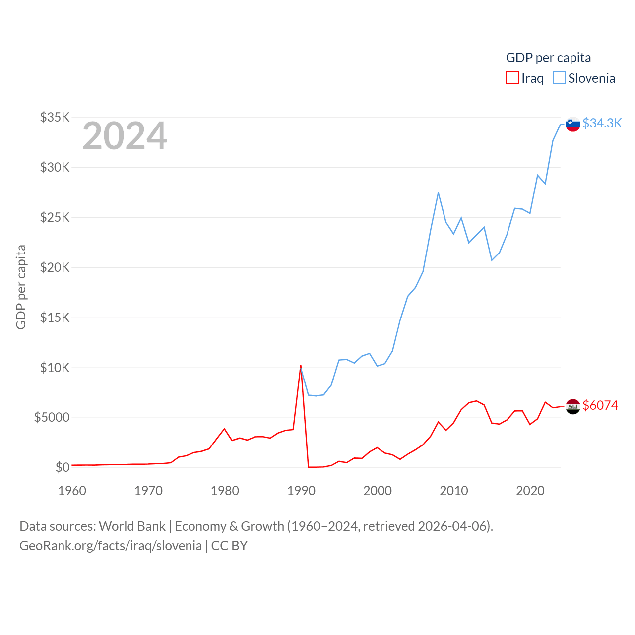 By GDP, Iraq ranks 50/197 ($280B) and Slovenia ranks 86/197 ($73B). By GDP per capita, Iraq ranks 113/197 ($6,074), while Slovenia ranks 34/197 ($34,301).