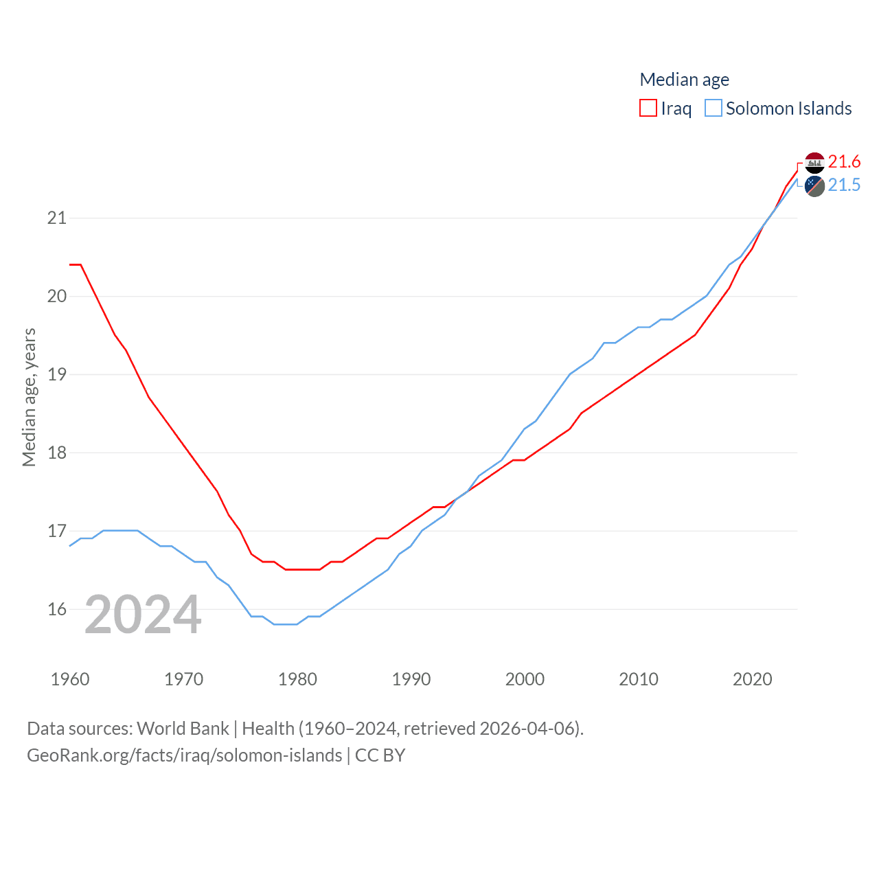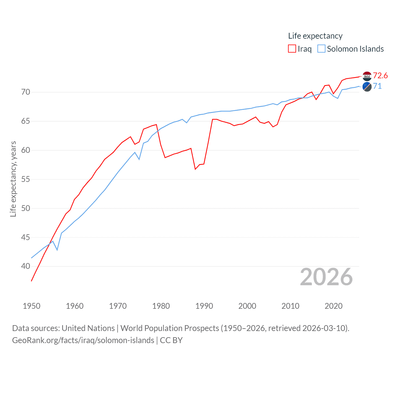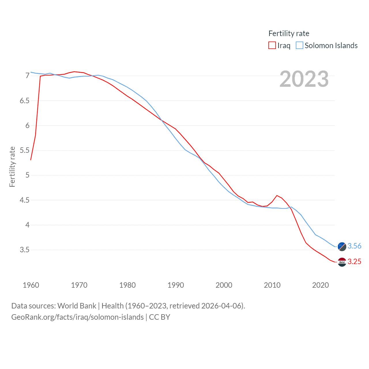 Iraq has a population of 46M (ranked 34/197), compared with 819K in The Solomon Islands (ranked 162/197). Iraq's land area is 167,619 sq mi versus 10,807 sq mi for The Solomon Islands (ranked 57th vs. 141st).