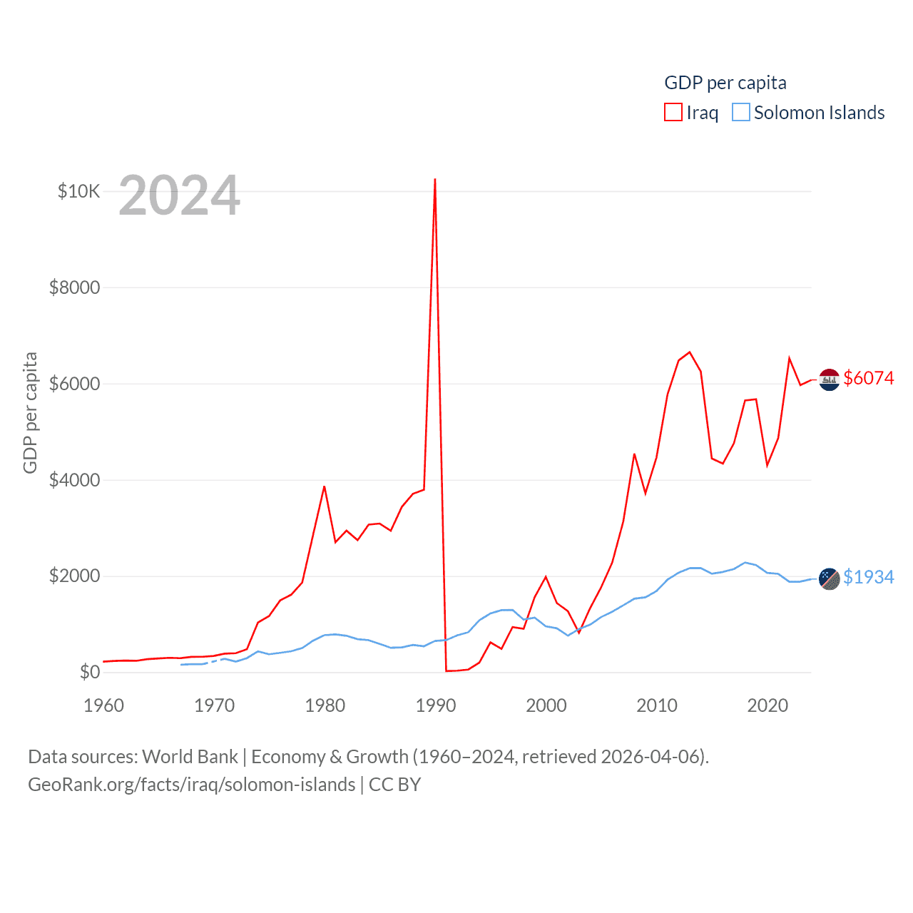 By GDP, Iraq ranks 50/197 ($280B) and The Solomon Islands ranks 182/197 ($1.58B). By GDP per capita, Iraq ranks 113/197 ($6,074), while The Solomon Islands ranks 157/197 ($1,934).