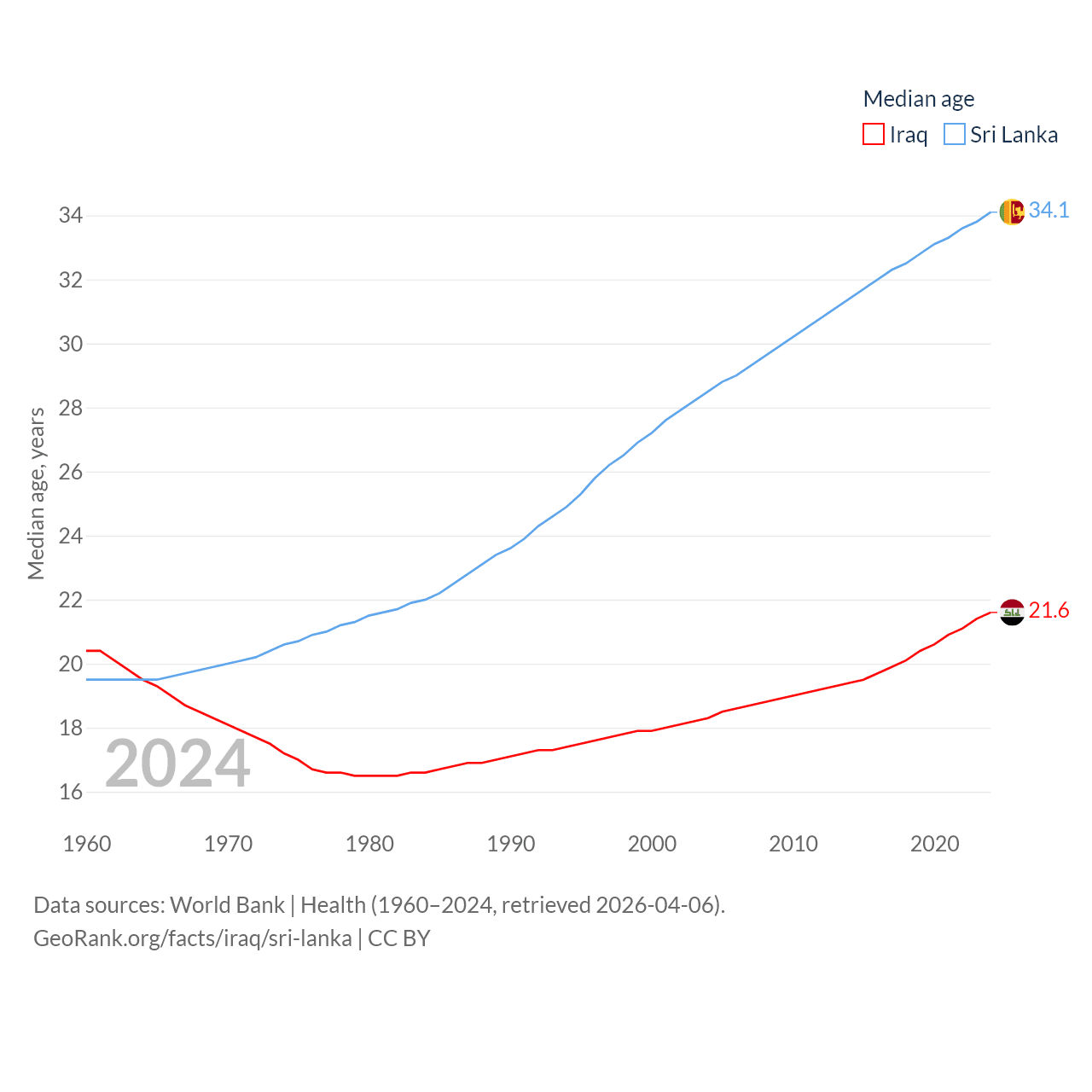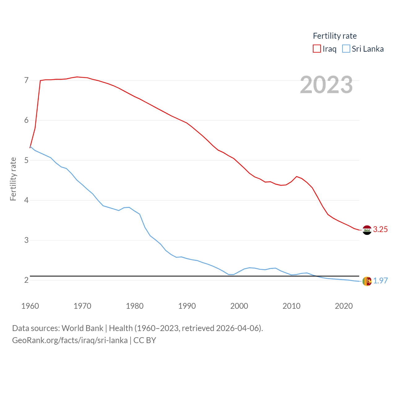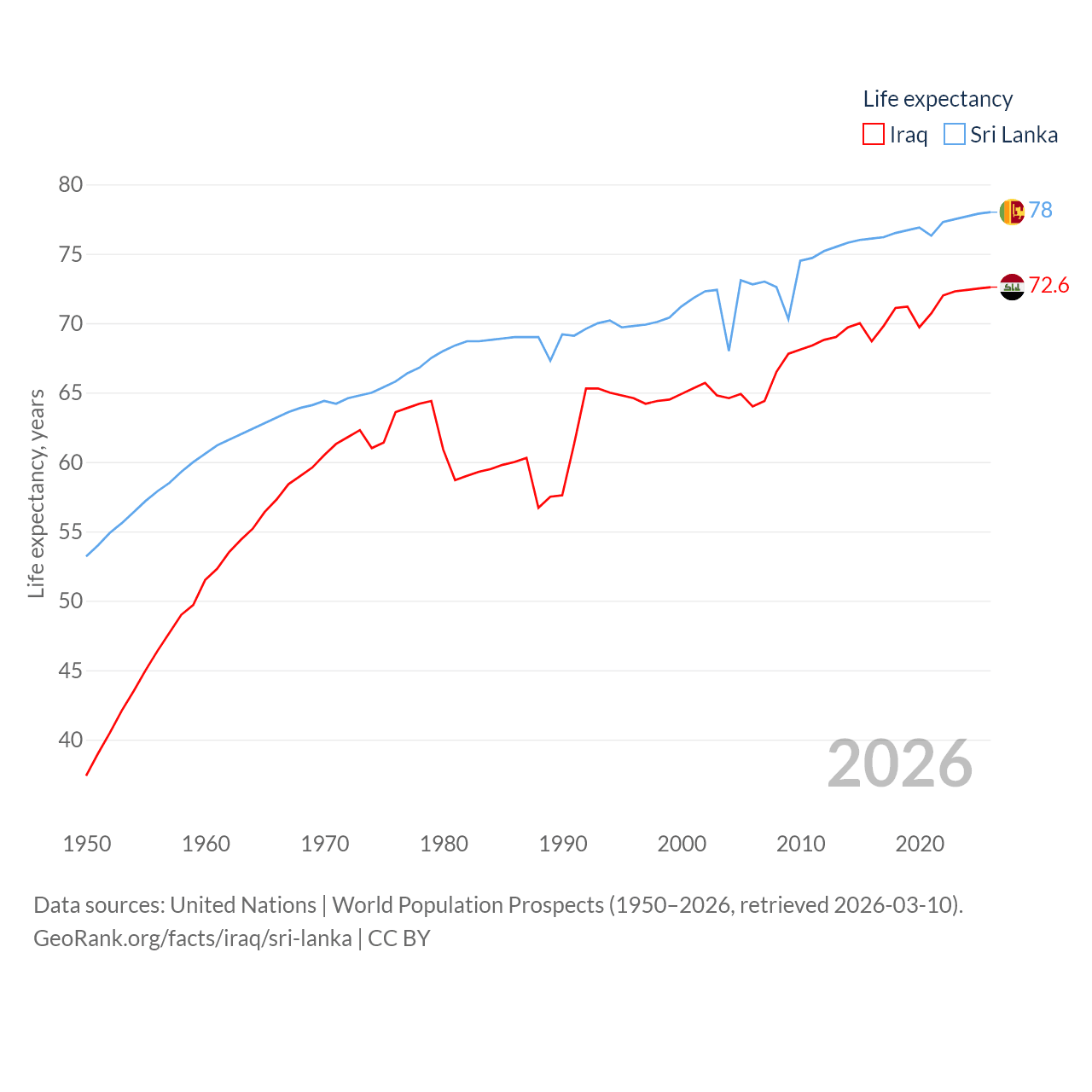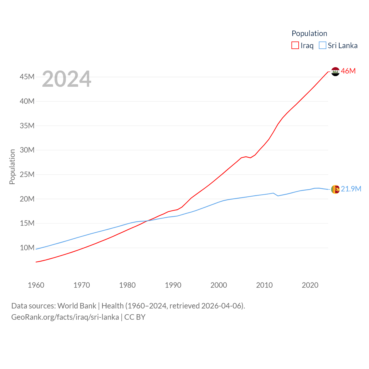 Iraq has a population of 46M (ranked 34/197), compared with 21.9M in Sri Lanka (ranked 61/197). Iraq's land area is 167,619 sq mi versus 23,884 sq mi for Sri Lanka (ranked 57th vs. 122nd).