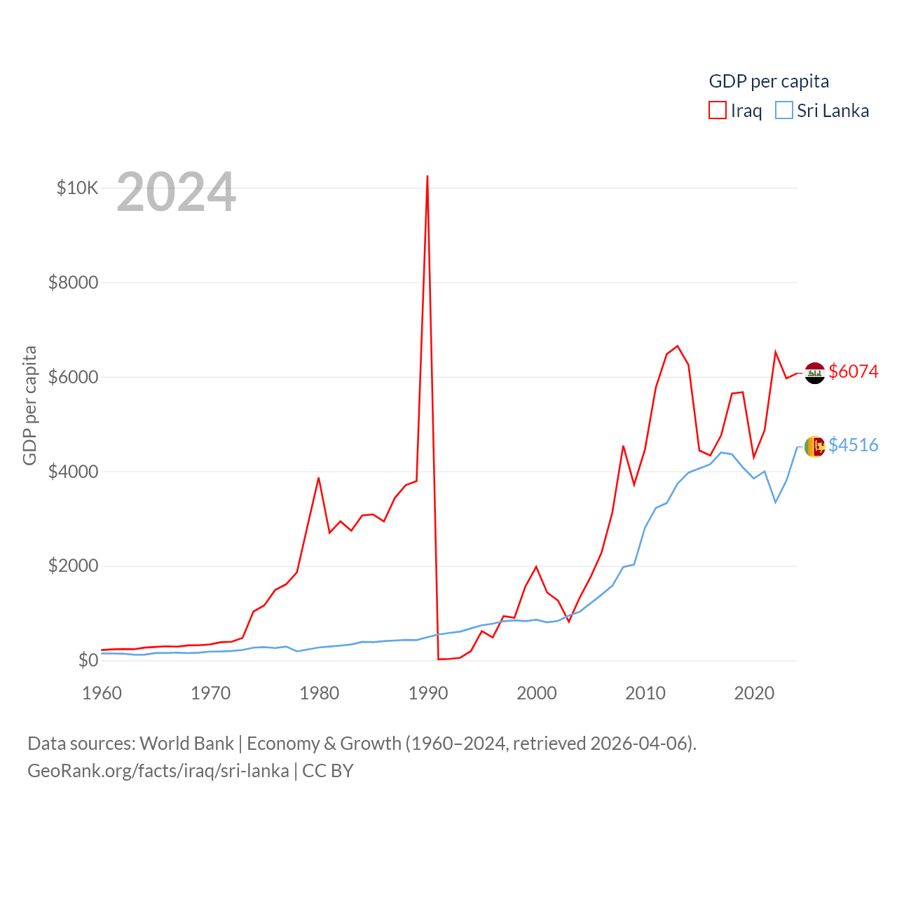 By GDP, Iraq ranks 50/197 ($280B) and Sri Lanka ranks 72/197 ($99B). By GDP per capita, Iraq ranks 113/197 ($6,074), while Sri Lanka ranks 124/197 ($4,516).