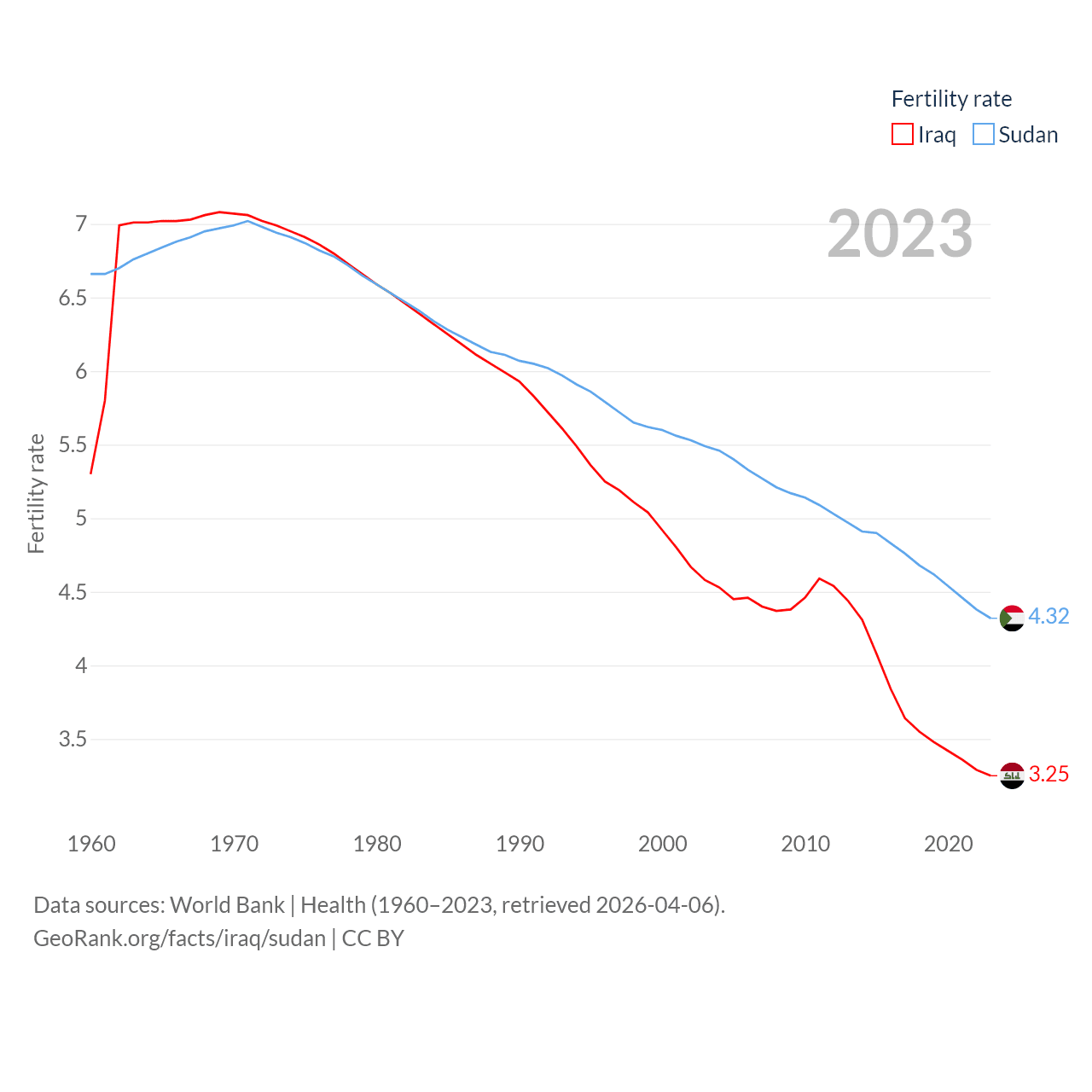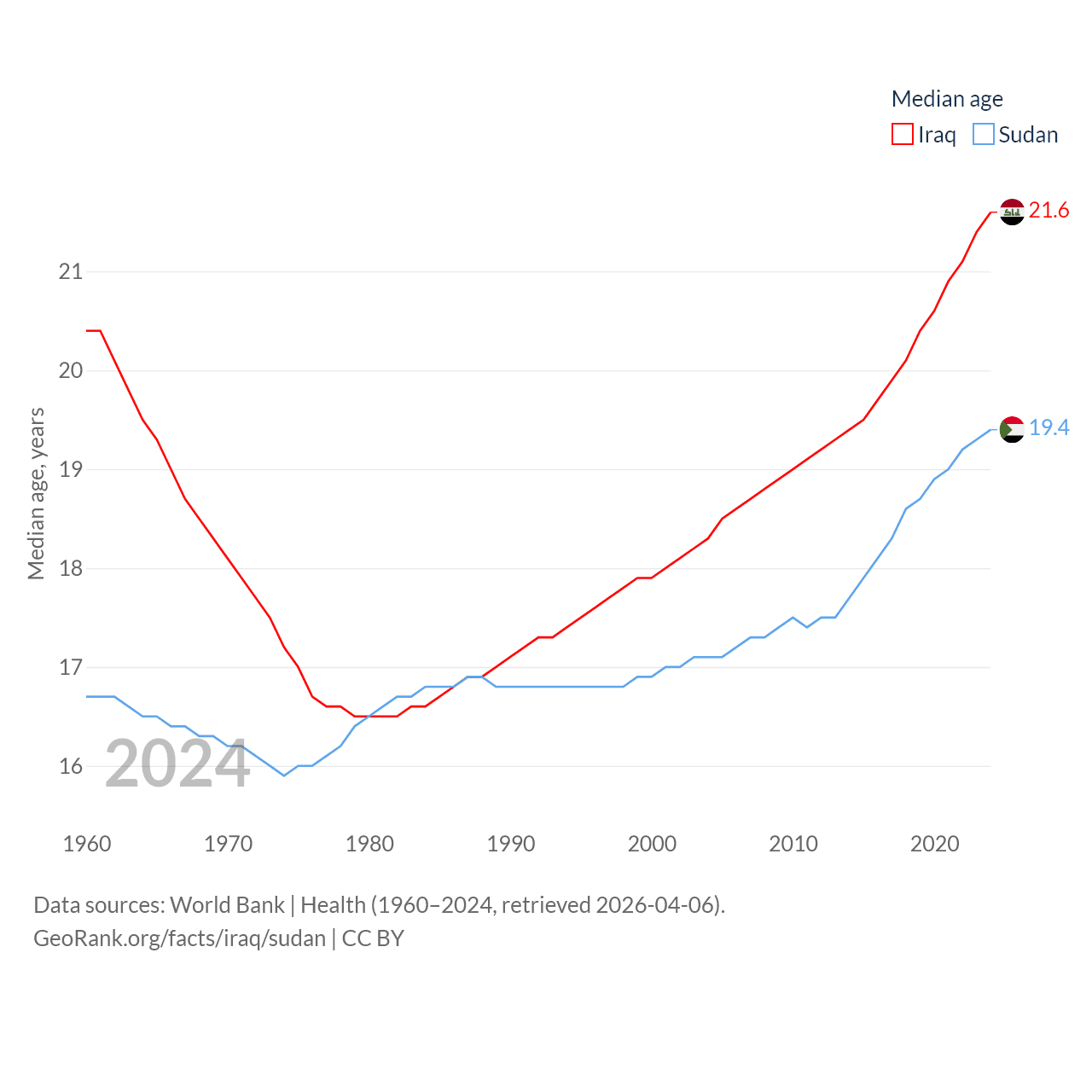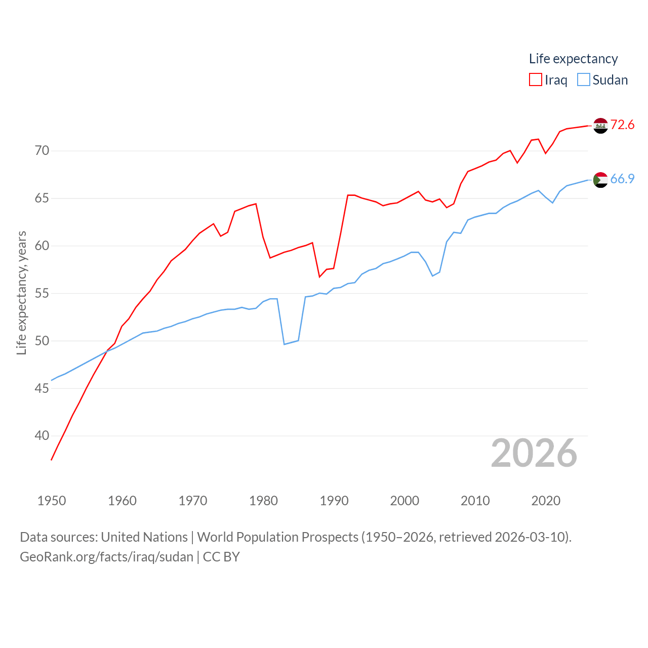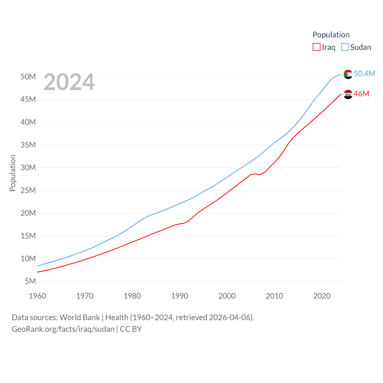 Iraq has a population of 46M (ranked 34/197), compared with 50.4M in Sudan (ranked 30/197). Iraq's land area is 167,619 sq mi versus 721,239 sq mi for Sudan (ranked 57th vs. 15th).